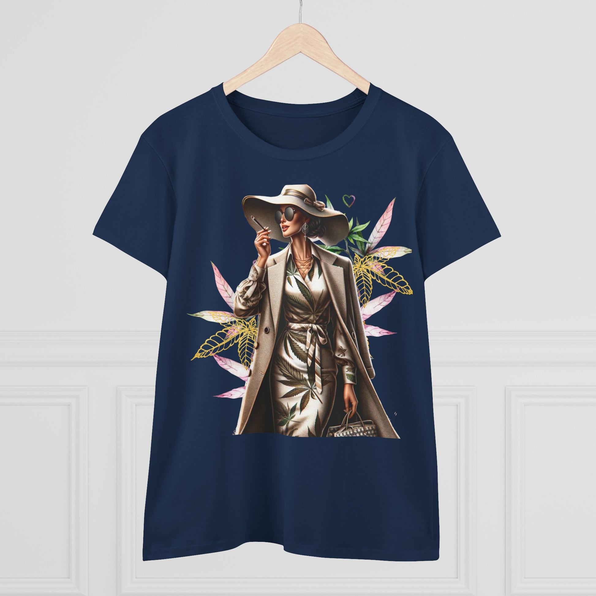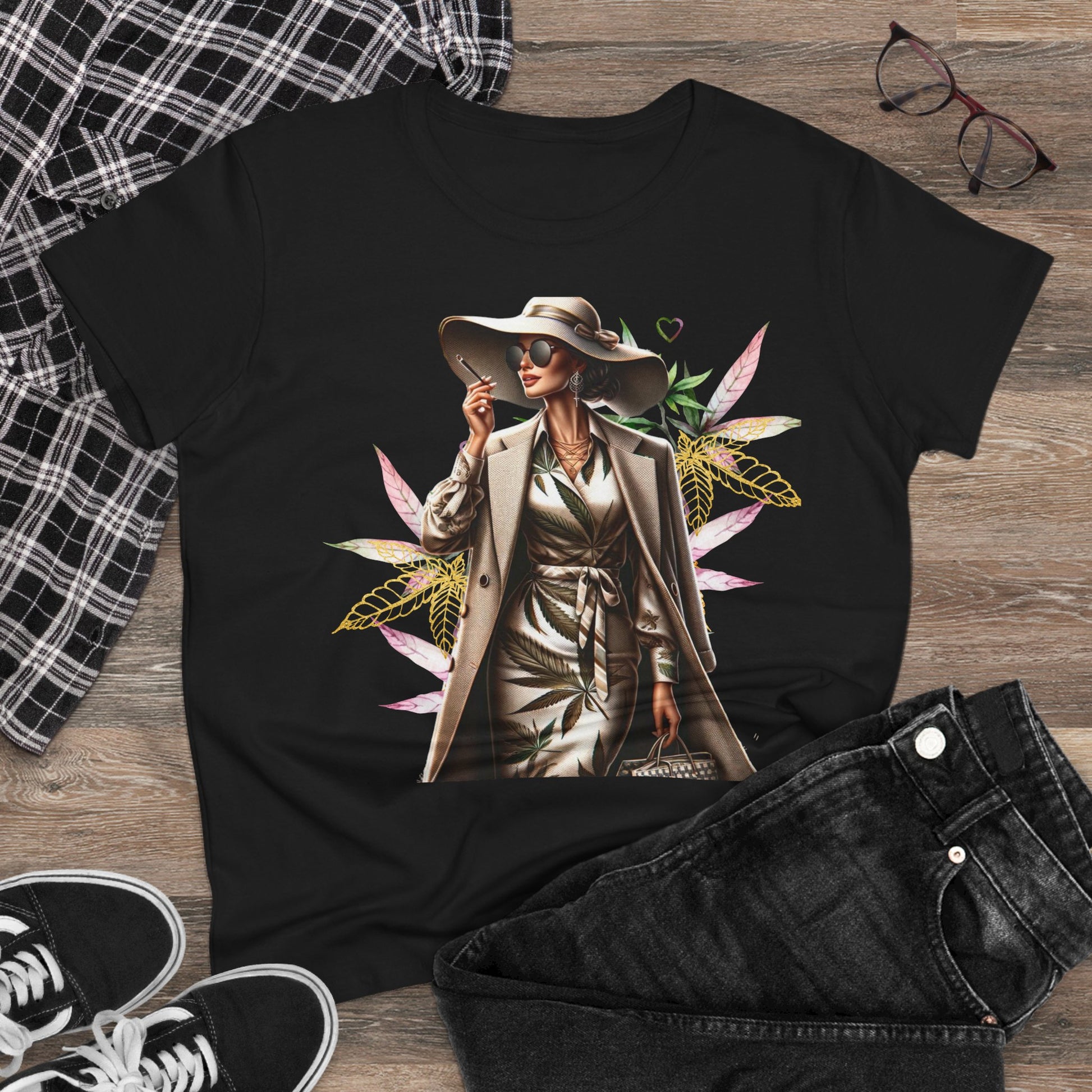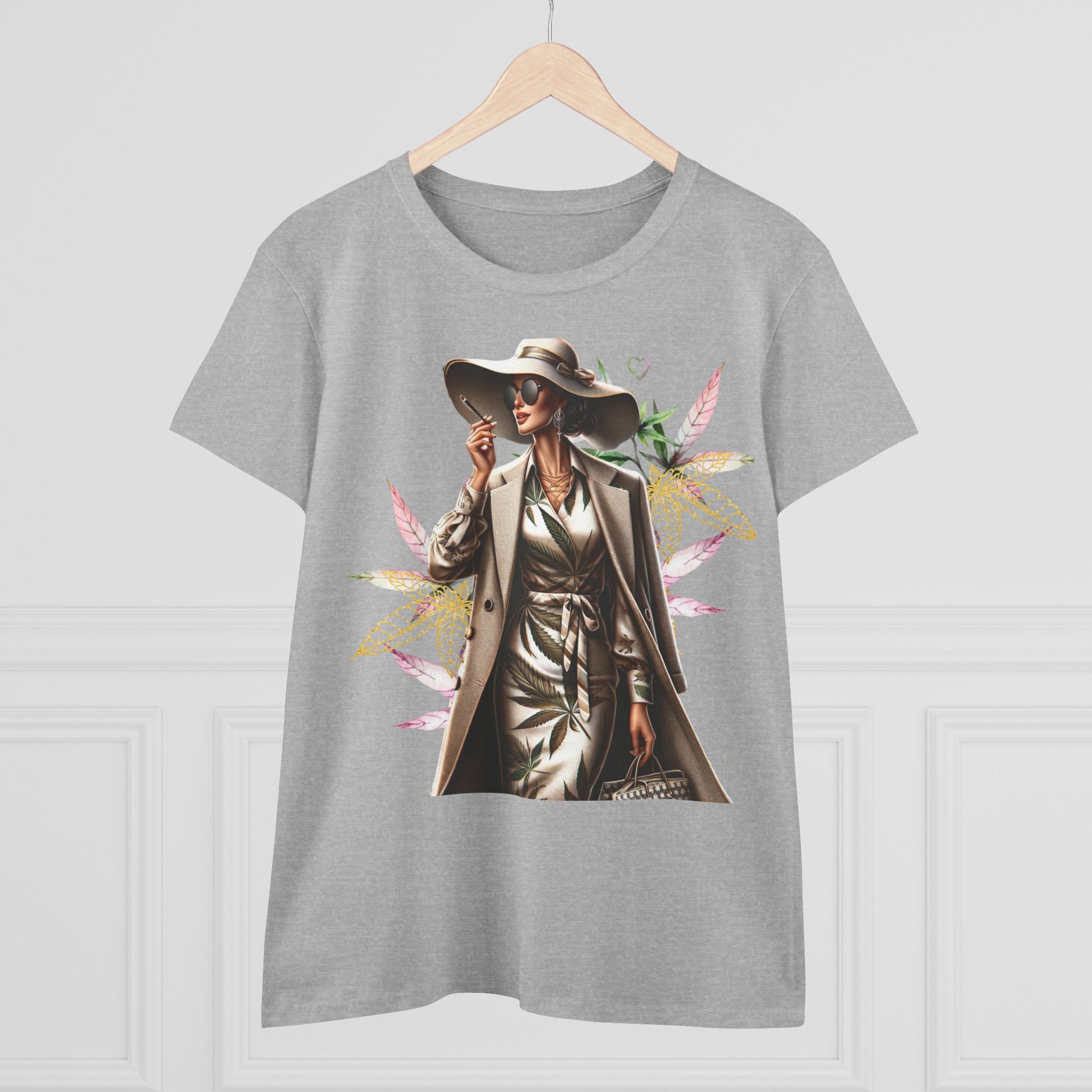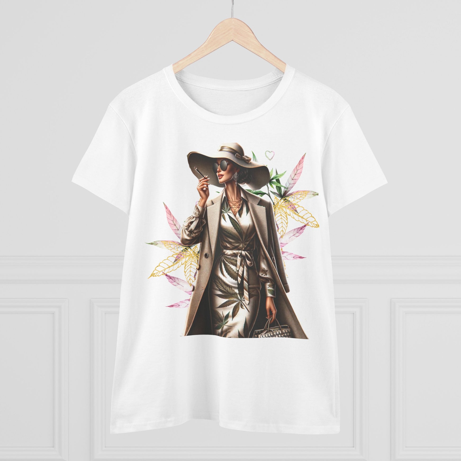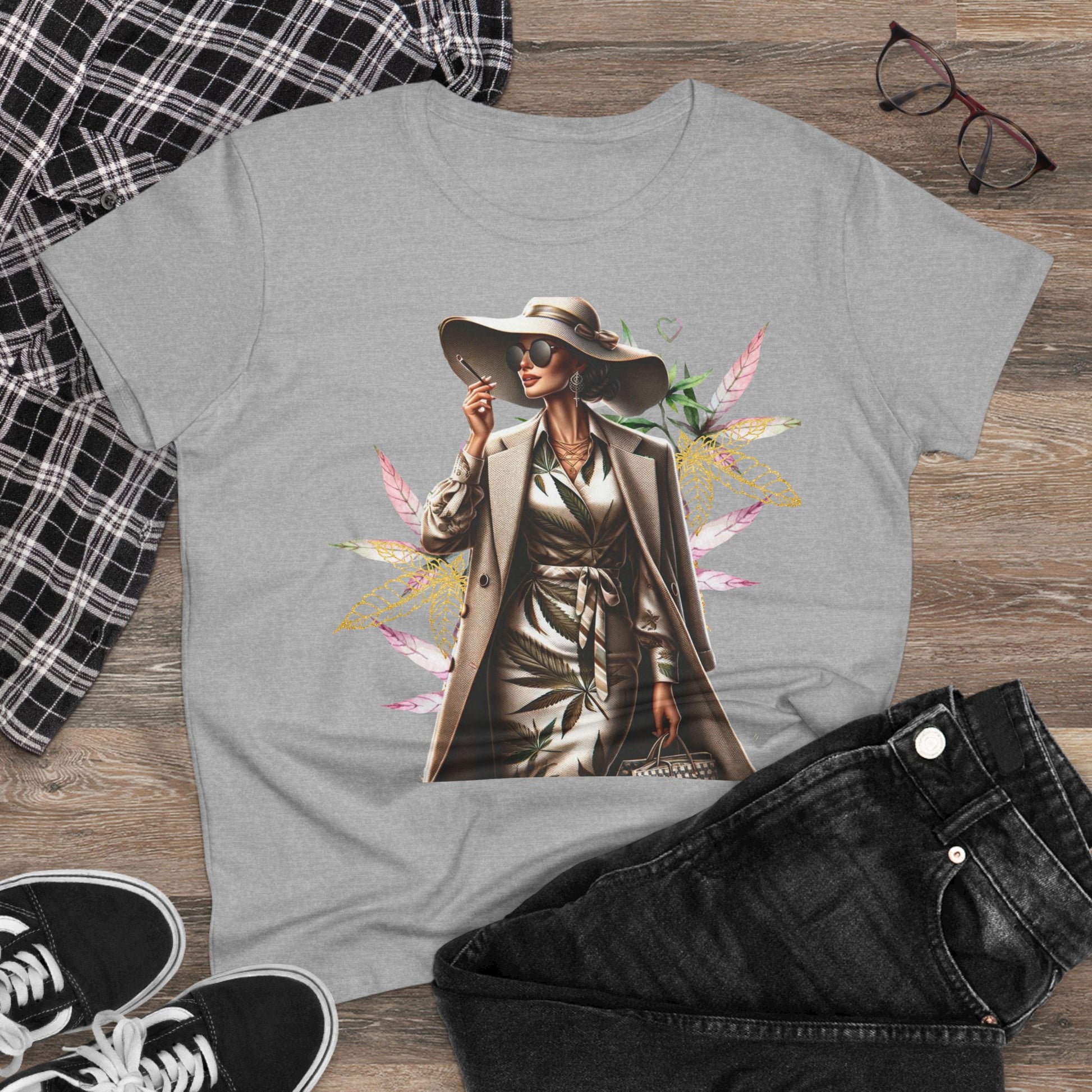 A chic, midweight cotton tee that feels like stepping into a sunny city boulevard. The graphic shows a confident woman in a trench and wide-brim hat, framed by soft watercolor leaves — a blend of urban polish and gentle nature. Wear it on slow mornings with coffee and a notebook, or layered under a blazer for relaxed meetings. The semi-fitted cut follows your shape without clinging, and the fabric weight gives structure while staying breathable. Small, thoughtful details like neck-and-shoulder tape and double-stitched hems mean this shirt keeps its shape through repeat wear. It’s for women who move between city streets and green pockets, who want clothing that reads stylish and grounded at the same time.