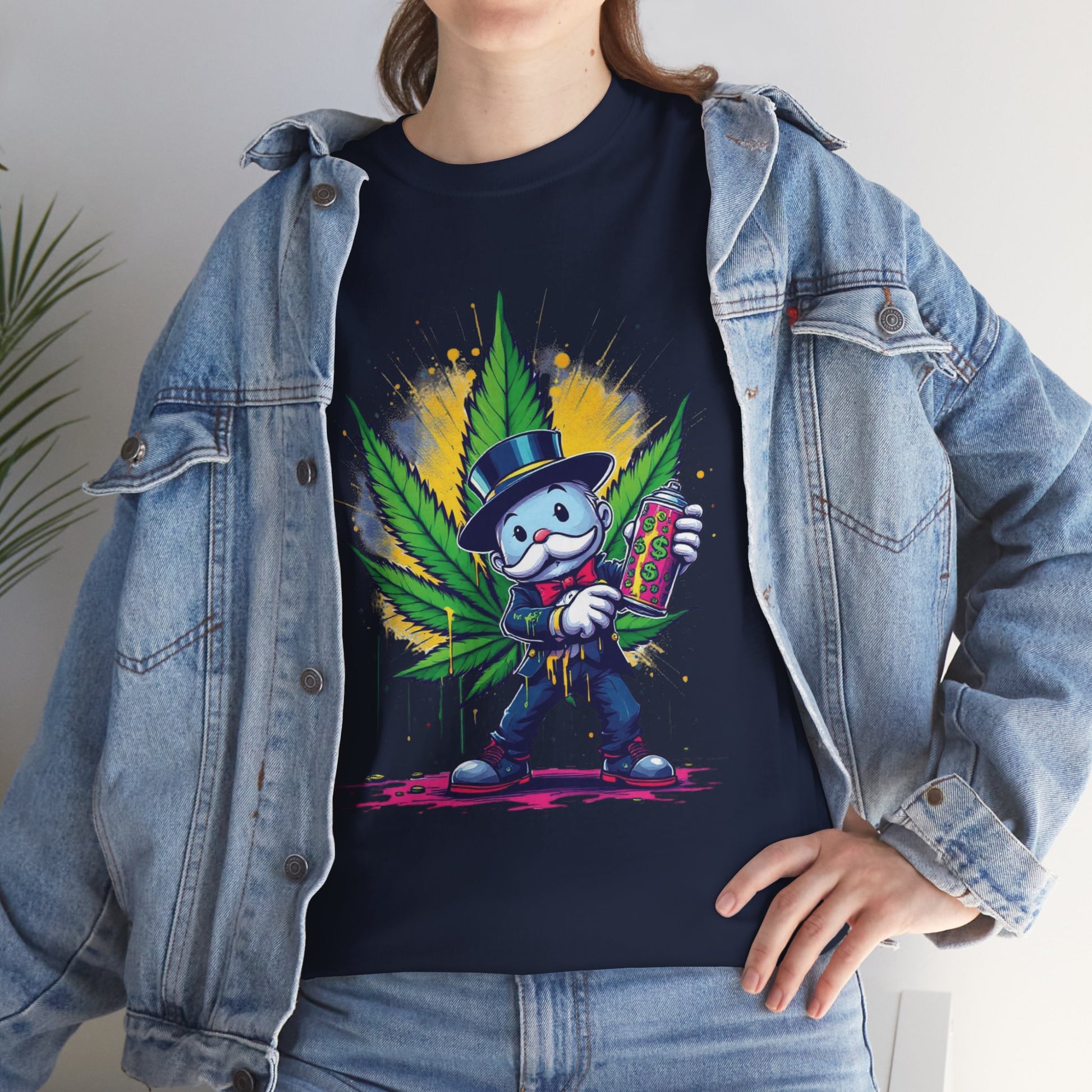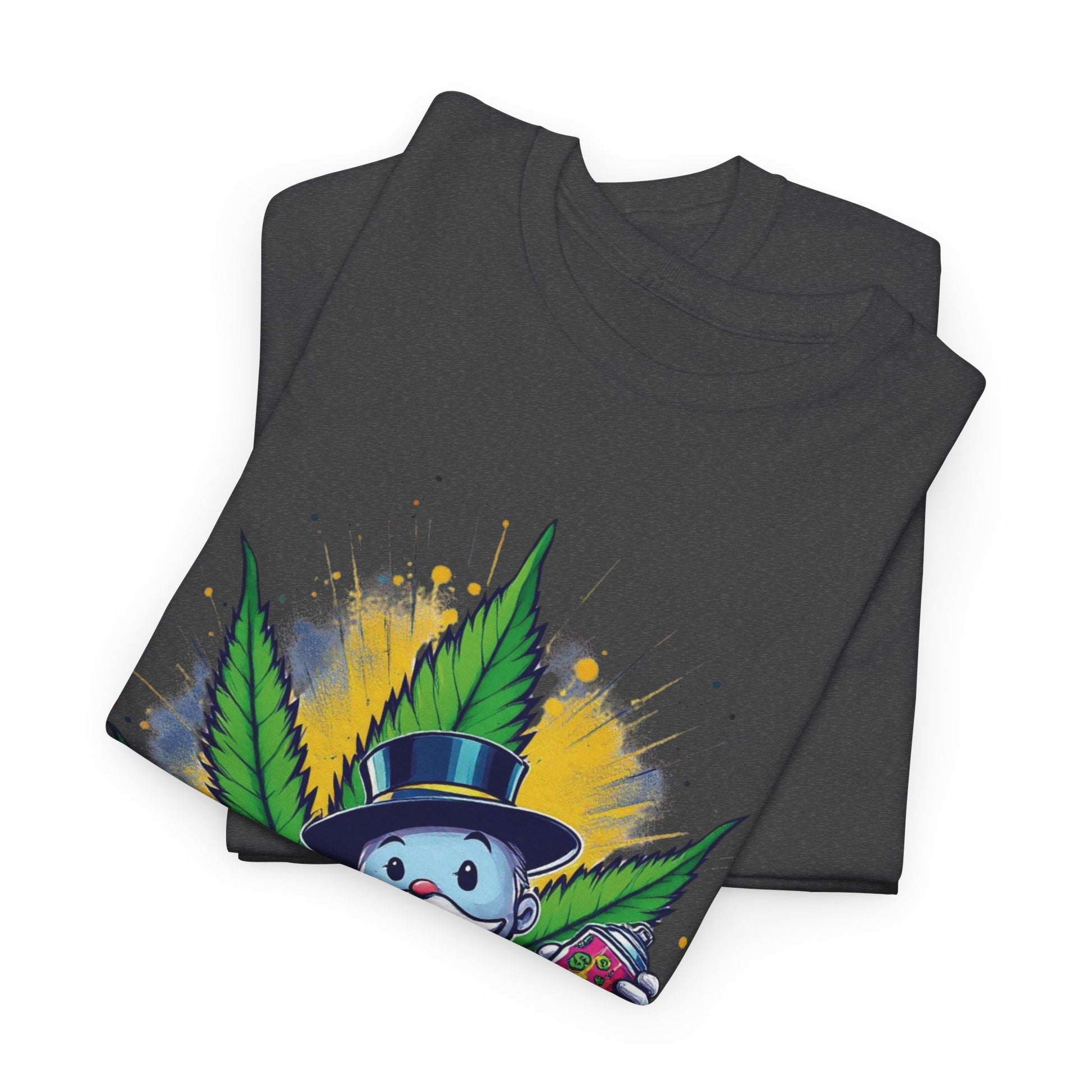 This relaxed crew-neck tee brings playful, street-art energy to everyday wear. A bold, colorful print of a mischievous character holding a spray can stands against a vivid burst and stylized leaf motif — the artwork feels like a midnight mural come to life. The midweight cotton drapes comfortably for casual days, late-night meetups, or creative sessions in the studio. It’s the kind of shirt that sparks conversation and adds personality without trying too hard. Wear it with worn denim, high-tops, or layered under a jacket when you want your style to do the talking.