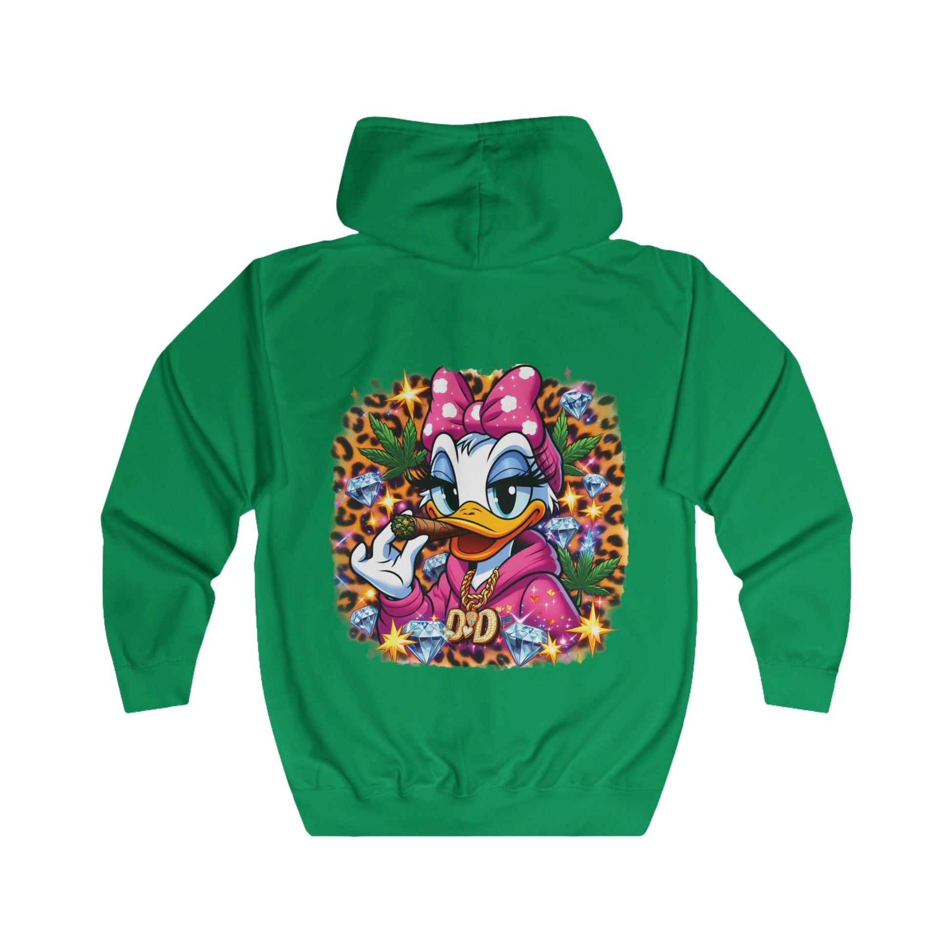 This zip-up hoodie blends playful nostalgia with bold street-style energy. Soft, medium-weight cotton keeps the fit cozy while the roomy cut and kangaroo pockets invite long walks, late-night drives, or lounging with friends. A small pink leaf emblem sits on the chest like a wink, while the back bursts with a colorful, cartoon-inspired duck motif framed by leopard print and sparkles — bright, cheeky, and unapologetically fun. Throw it on over jeans or joggers to add a pop of personality to everyday outfits and bring a lively, retro-cartoon vibe to casual nights out or relaxed weekends.