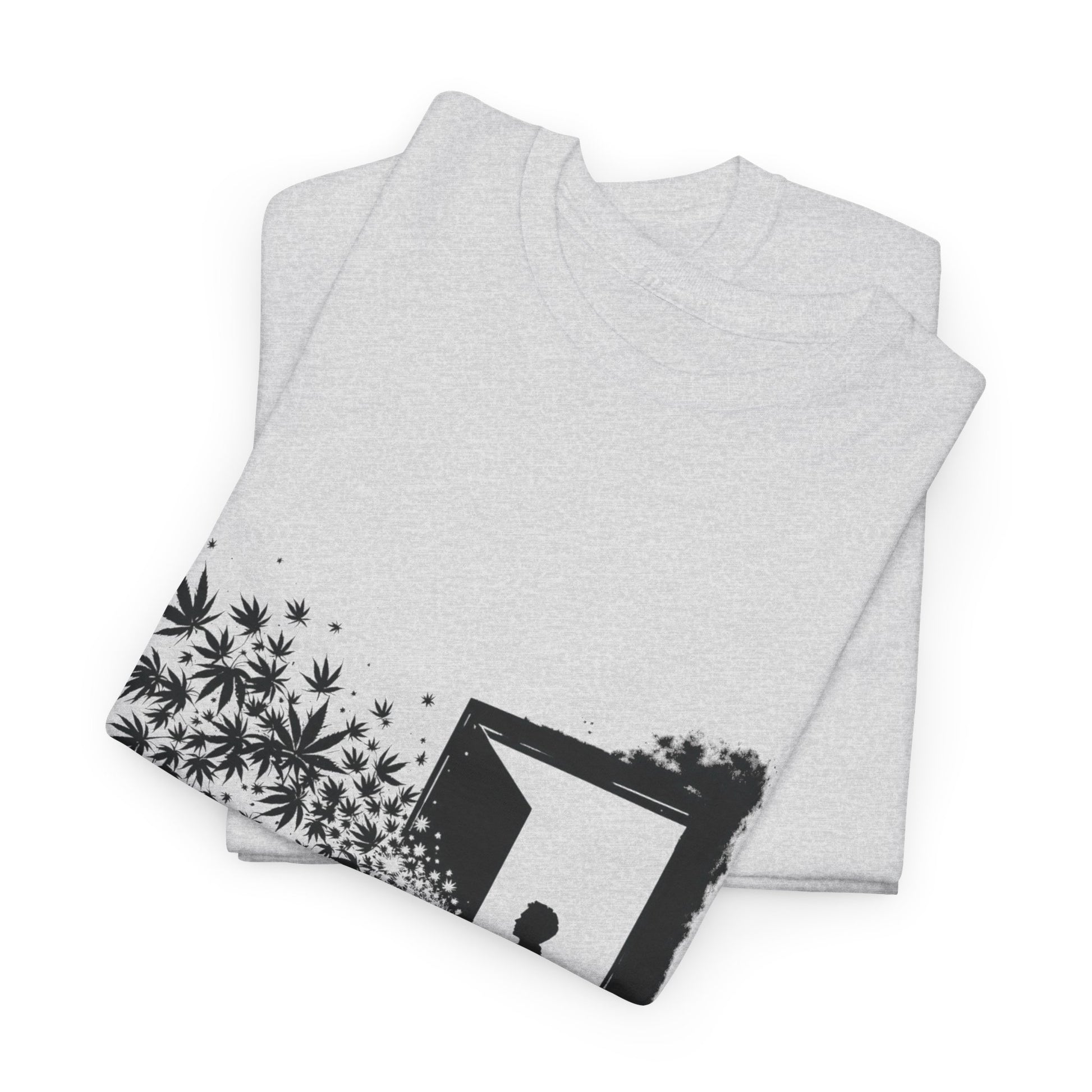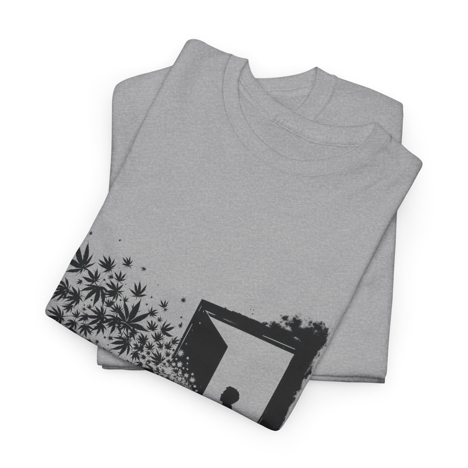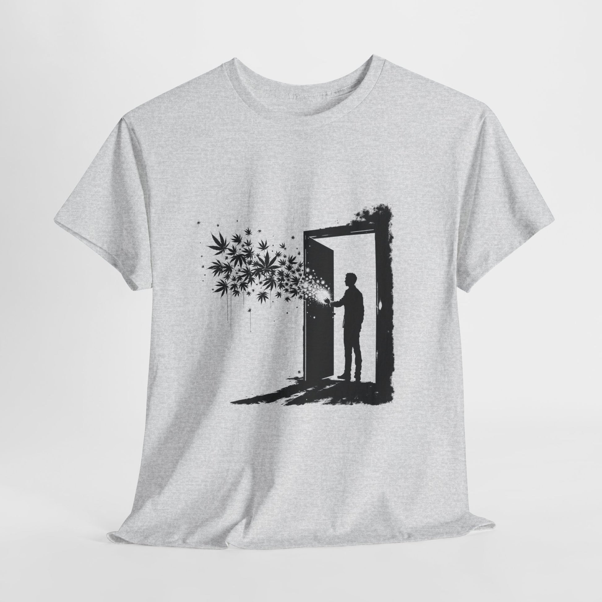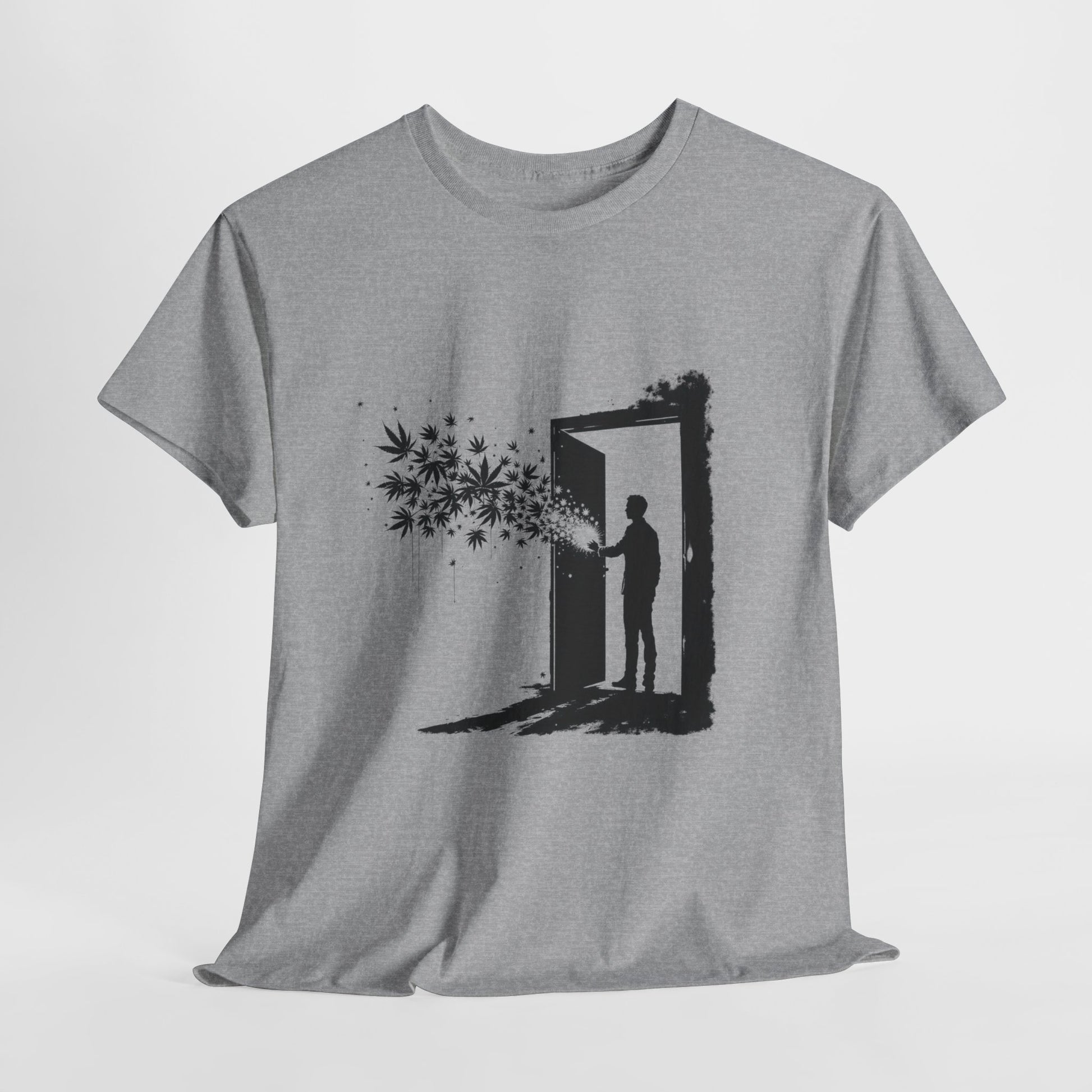 Lightweight, breathable, and built to last — this classic tee carries a quiet, evocative design: a silhouetted figure standing in a doorway while a flurry of stars or leaves drifts outward. The artwork reads like a private moment of departure or discovery, made for people who prefer subtle, thoughtful graphics over loud logos. Soft, smooth cotton gives the print crisp contrast, and the natural heather texture adds a lived-in feel that deepens the image’s gentle mystery. Wear it when you want clothing that speaks in small, poetic gestures — for slow mornings, gallery visits, low-key nights out, or long walks where ideas take shape.
