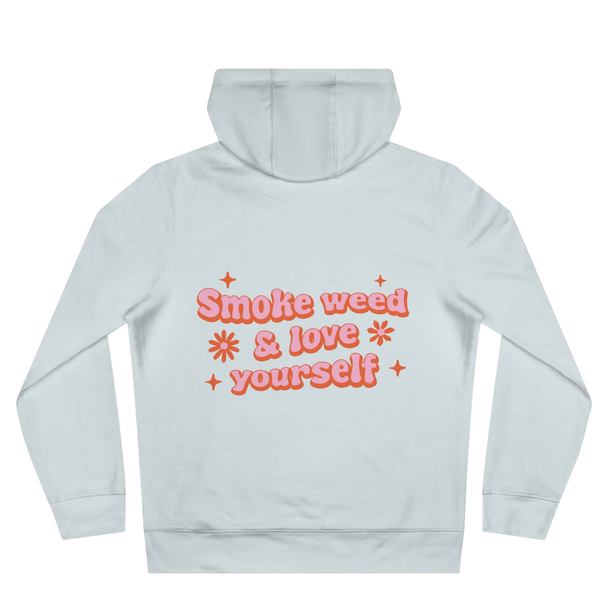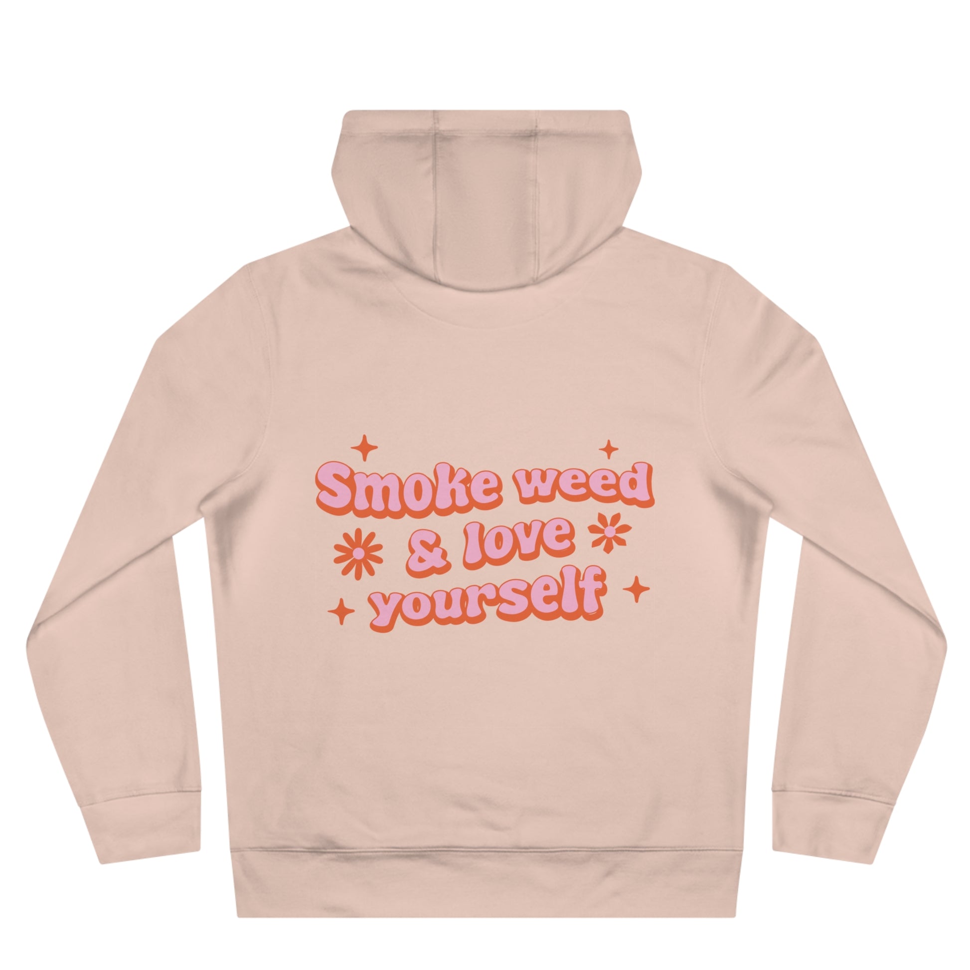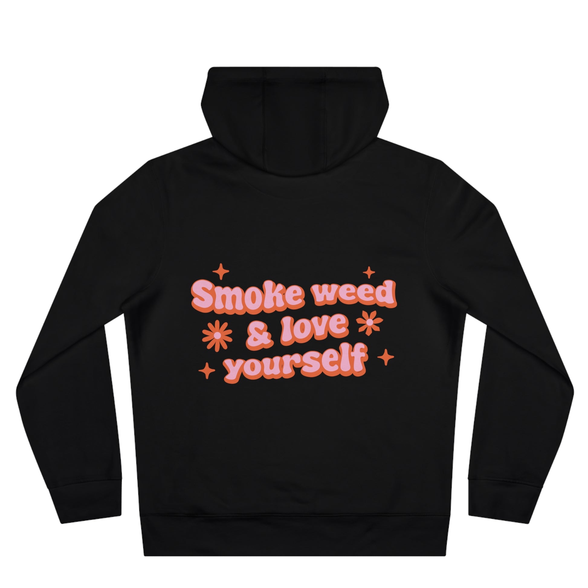 Soft, street-ready hoodie with playful, retro lettering that celebrates plant-based chill and self-care. The front features colorful, bubbly “Plant Based” typography accented with tiny leaves and stars. On the back, a warm, peachy message—“Smoke weed & love yourself”—appears in rounded, 70s-inspired script with sparkles, giving the hoodie a lighthearted, advocacy-forward vibe. The medium-heavy fabric and roomy hood create a cozy, worn-in feel that pairs with denim, joggers, or layered fall outfits. Wear it to low-key hangouts, mellow music nights, or weekends spent lounging and recharging. It’s for people who lean into cannabis-positive culture, body positivity, and relaxed, confident self-expression.