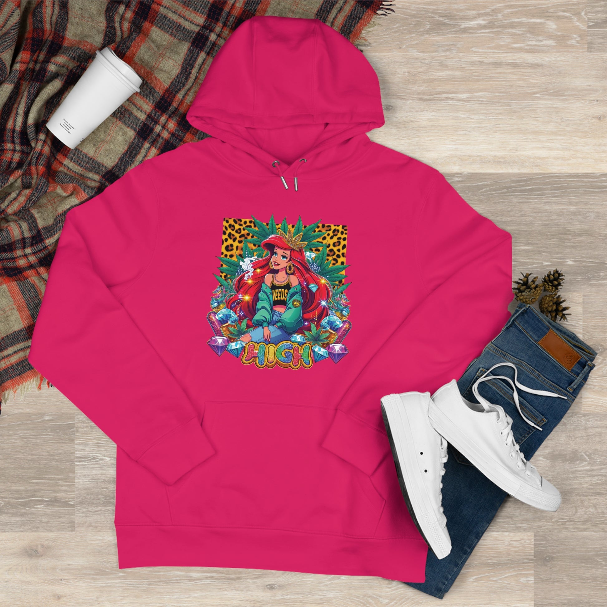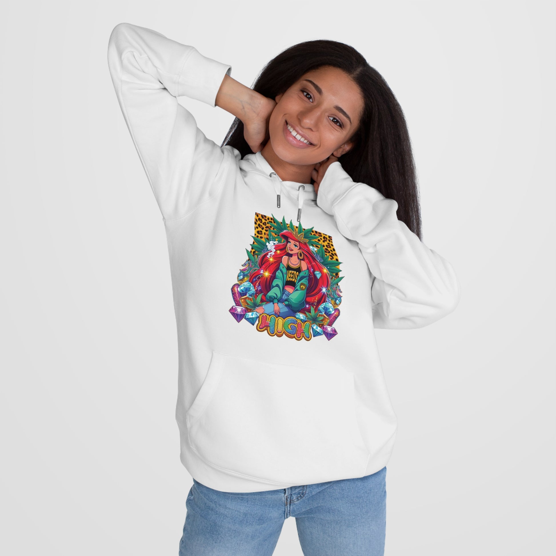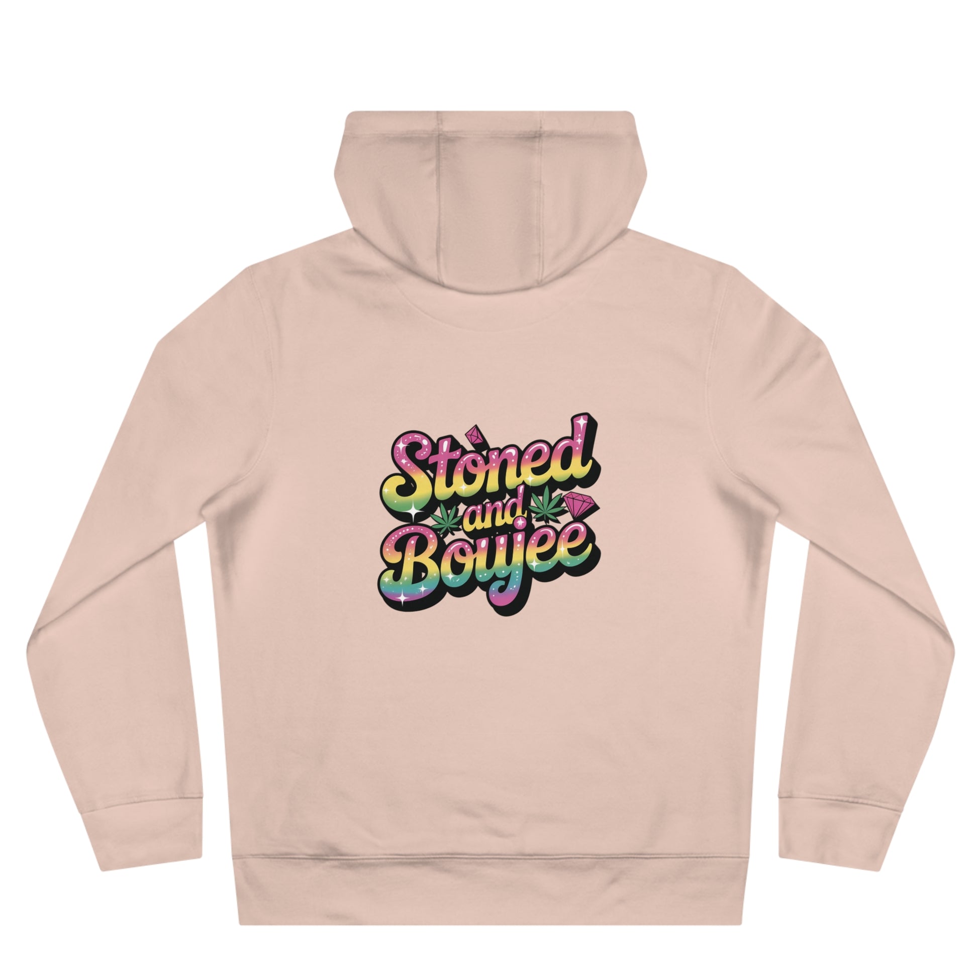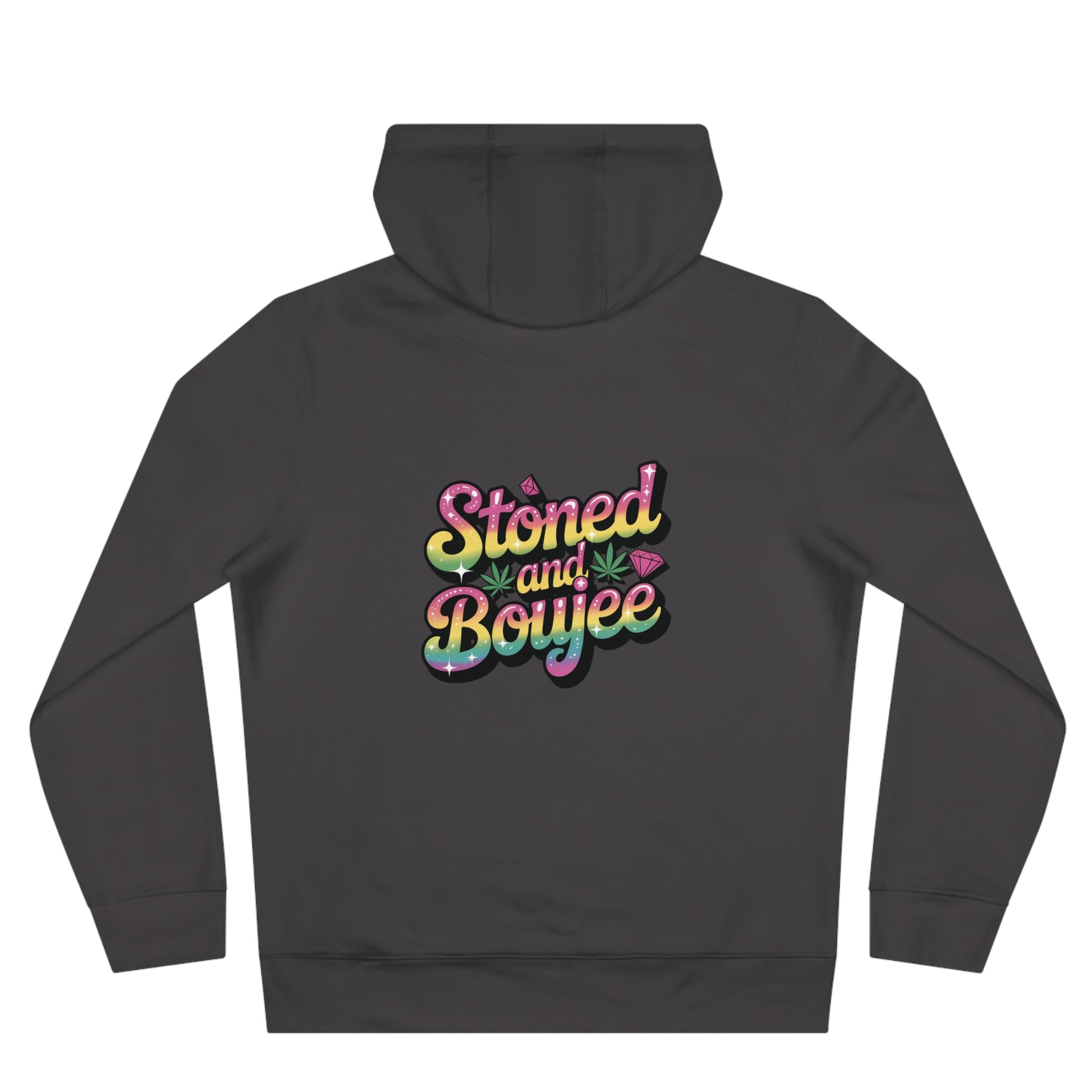 This hooded sweatshirt blends bold, playful street-style with cozy everyday wear. A vibrant, retro-inspired graphic centers the front — a colorful character surrounded by jewel tones and leopard accents — while the back displays a cheeky “Stoned and Boujee” script in glossy, candy-colored lettering. The midweight fabric feels substantial without being heavy, the adjustable hood and roomy kangaroo pocket add practical warmth, and the fitted seams keep the silhouette clean. It’s the kind of hoodie you reach for when you want to stand out in a crowd but stay wrapped in comfort.