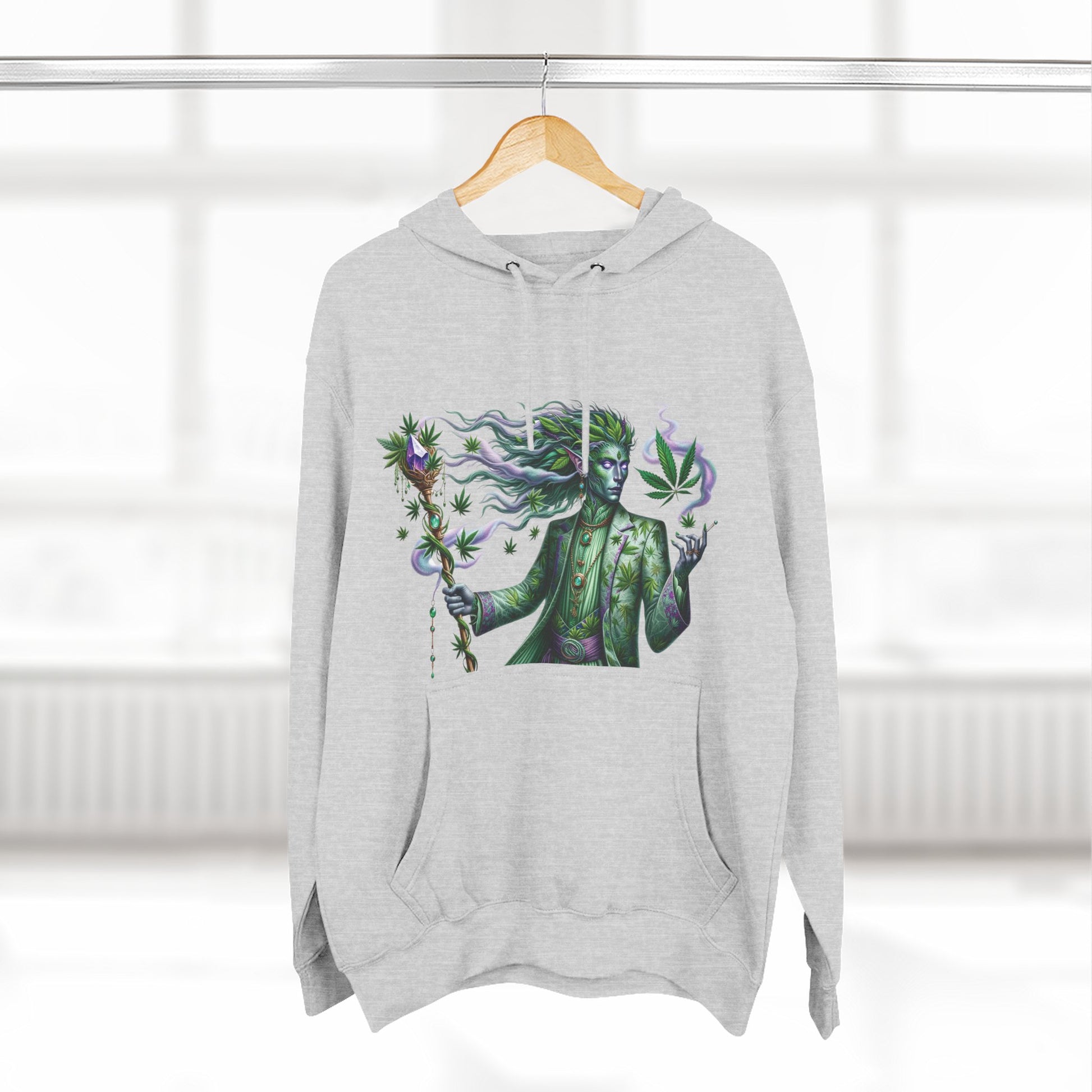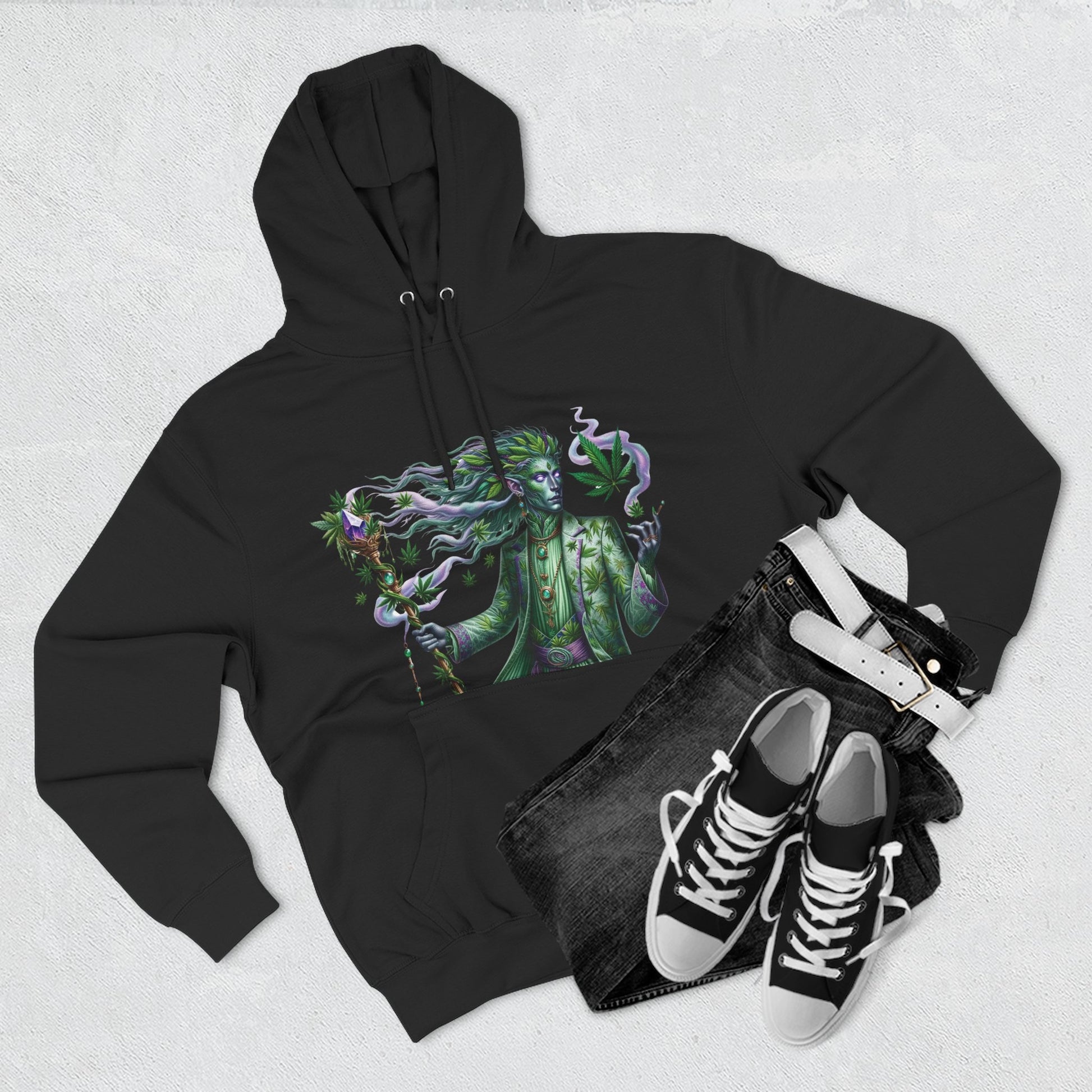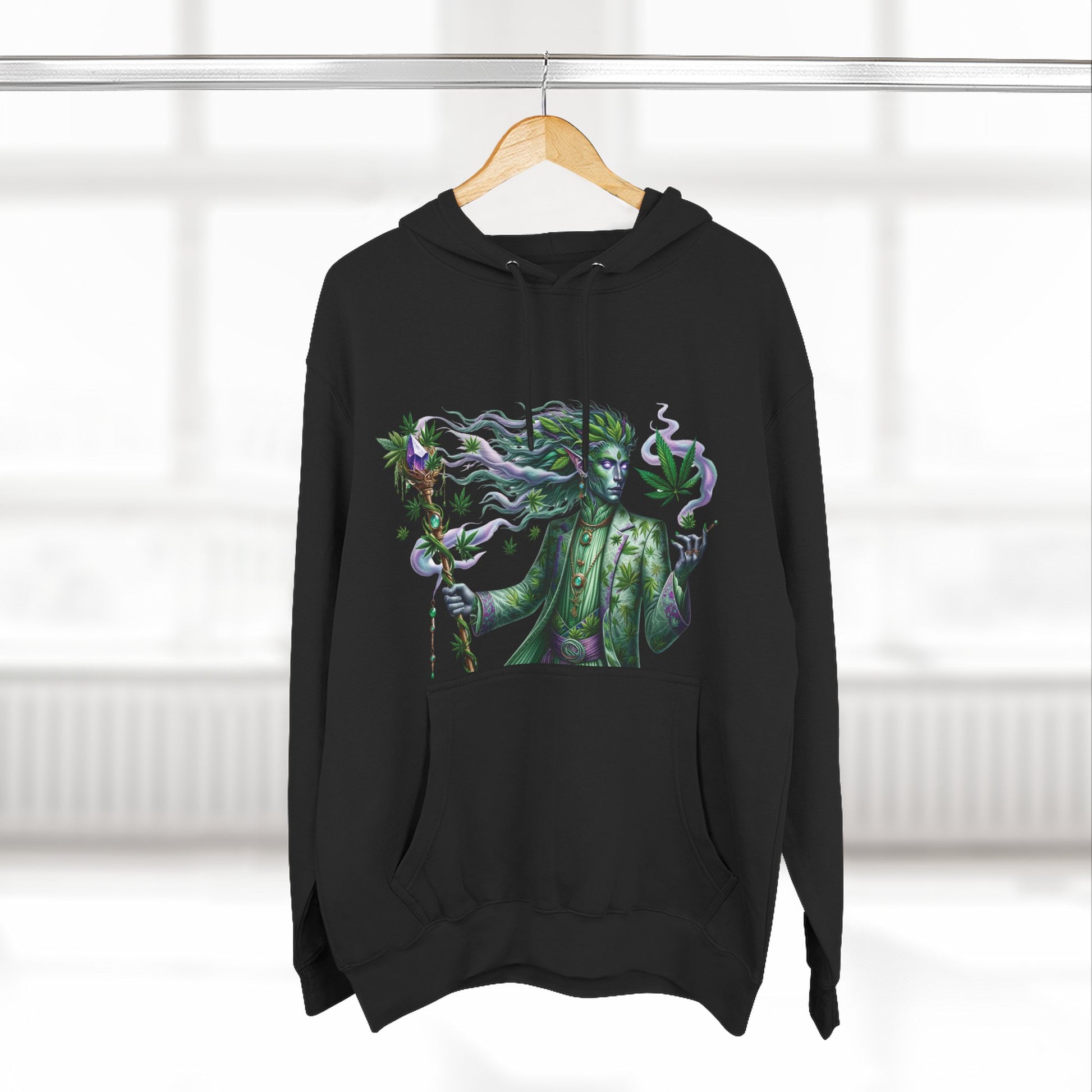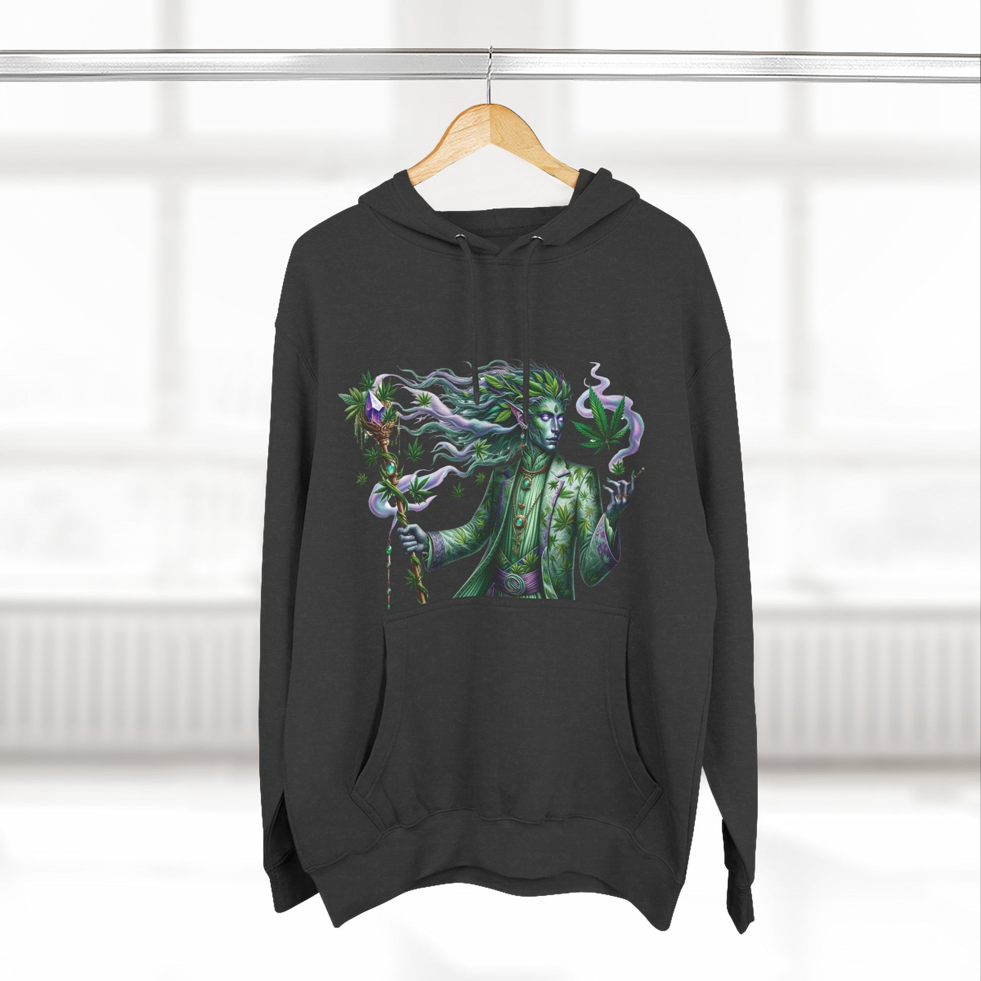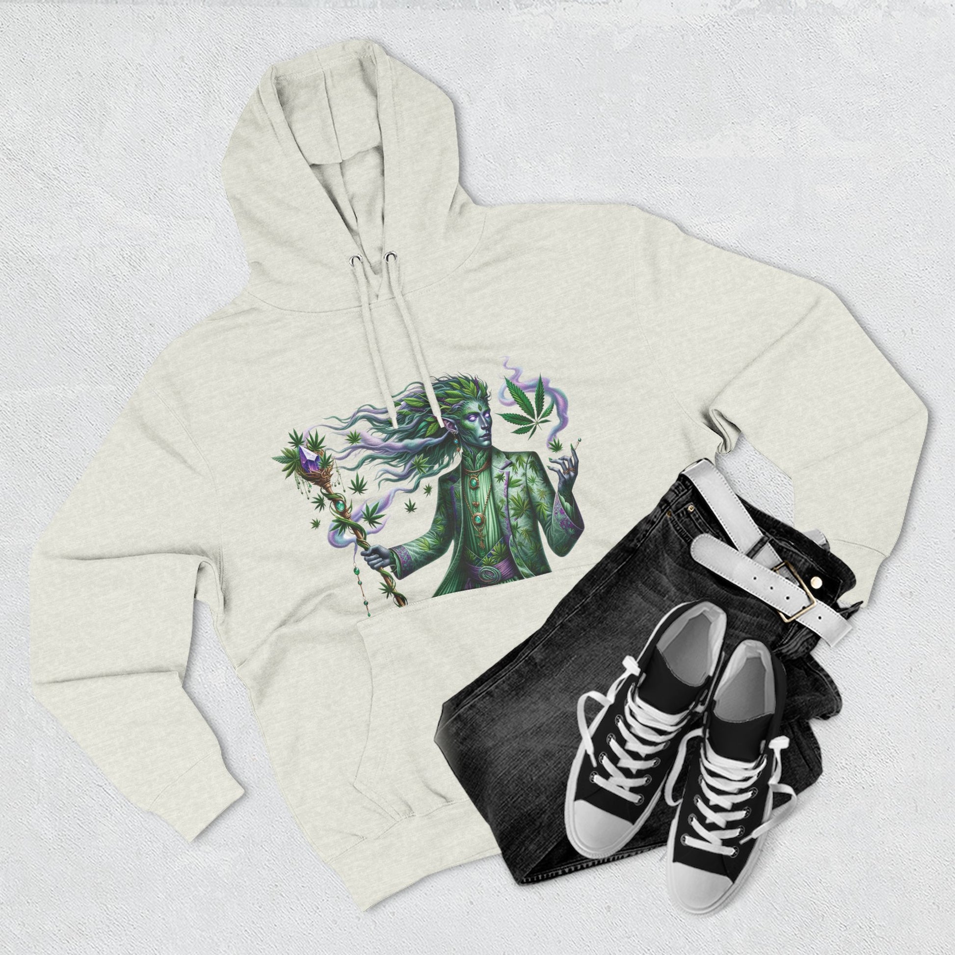 Crafted with a luxurious three-panel fleece lining, this pullover offers unmatched warmth and coziness, making it ideal for beating the cold in style. The design features a striking depiction of "Mintara," a mythical creature that embodies the balanced hybrid nature and potent effects of the Kush Mints strain. With its sleek humanoid form adorned in hues of mint green and deep purple, Mintara brings the hoodie to life, symbolizing creativity, balance, and a touch of the mystical.