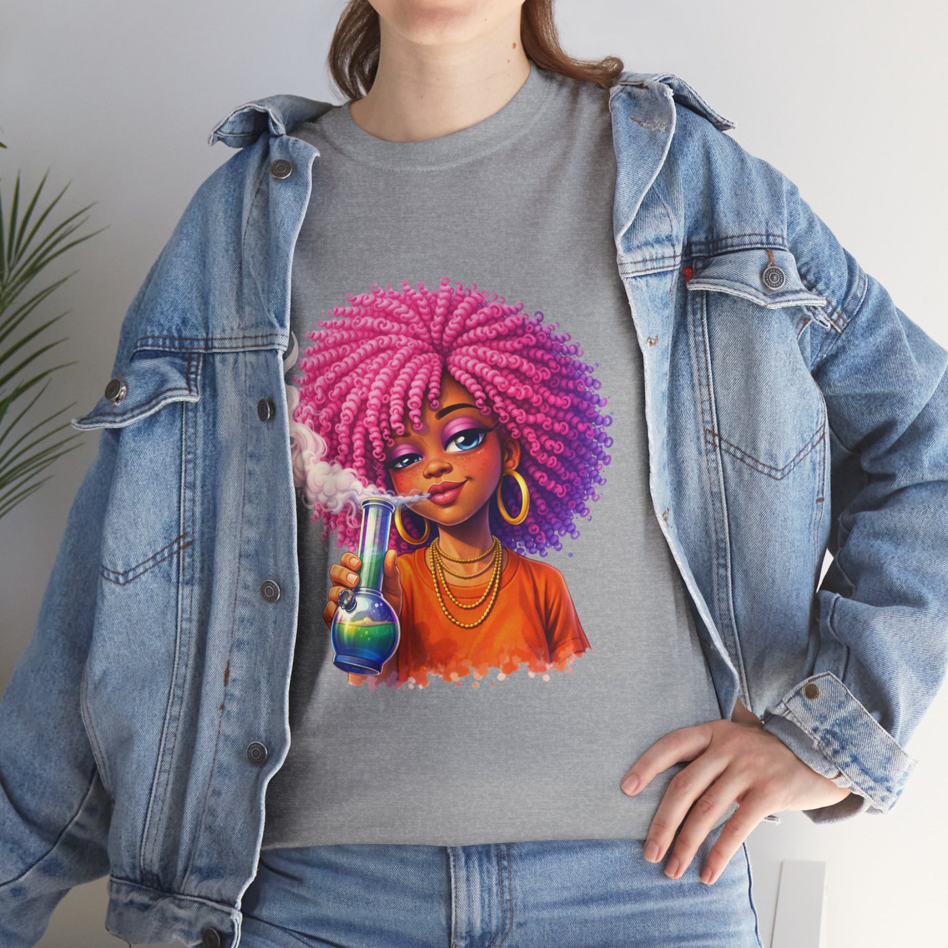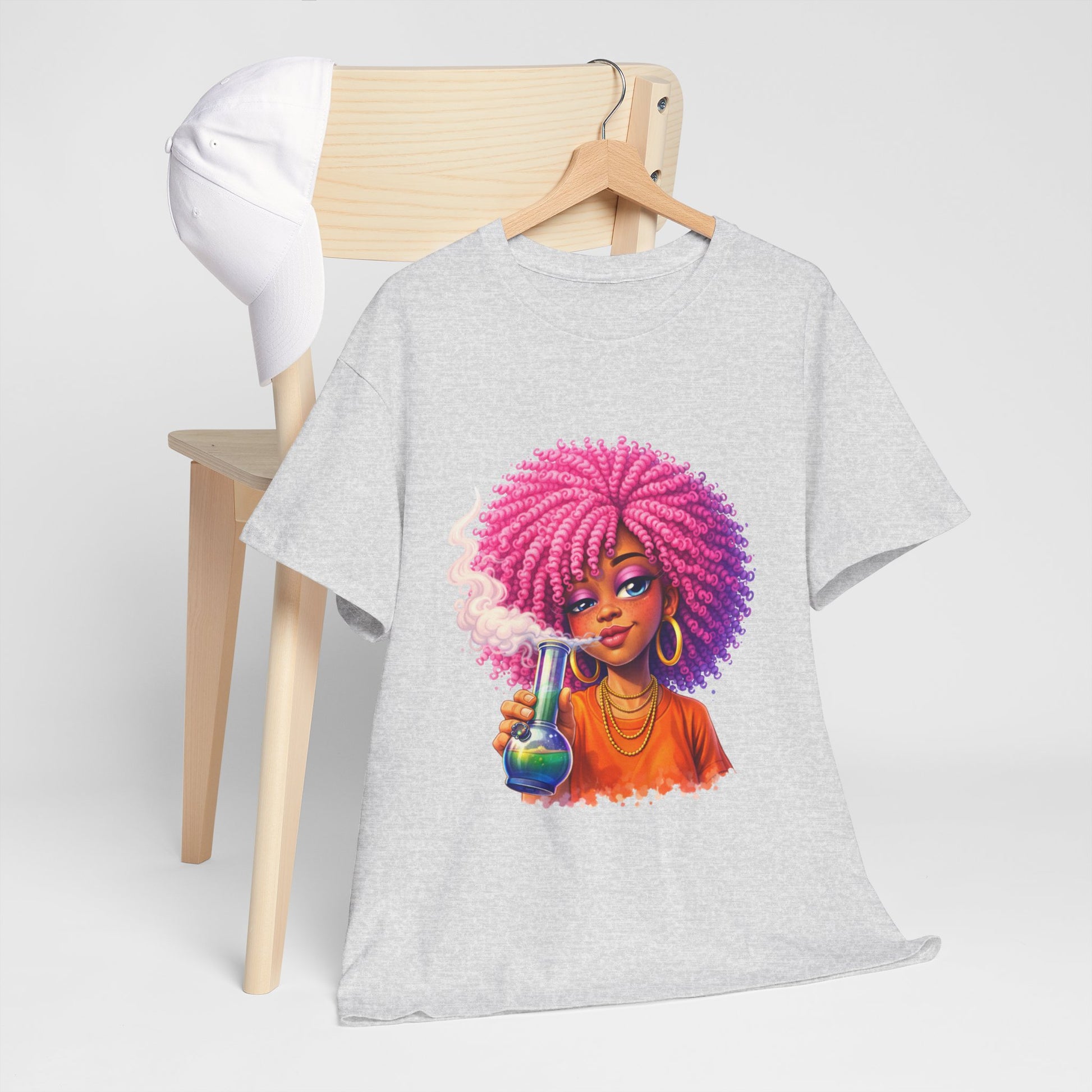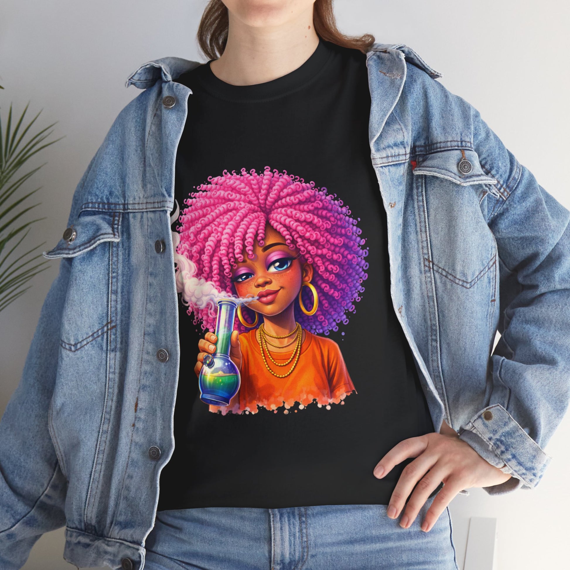 This soft, breathable tee carries a bright, playful portrait that feels like a snapshot from a late-afternoon hangout. The artwork shows a confident young woman with vivid pink hair, gold hoops, and a relaxed smile while holding a colorful beaker that lets off a dreamy puff of smoke—an image that blends urban style, creative curiosity, and a carefree vibe. Wear it to add a burst of color and personality to everyday jeans, layered streetwear, or low-key gatherings where conversation and creativity flow. The classic crew neck and slightly boxy silhouette sit comfortably on the shoulders and frame the print so the illustration pops without overpowering your look. It’s for people who enjoy bold self-expression and subtle humor, whether you’re sketching, chilling with friends, or exploring a local art fair.