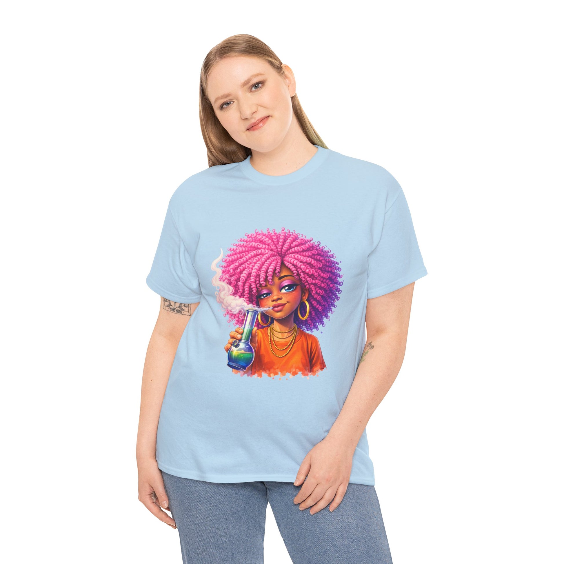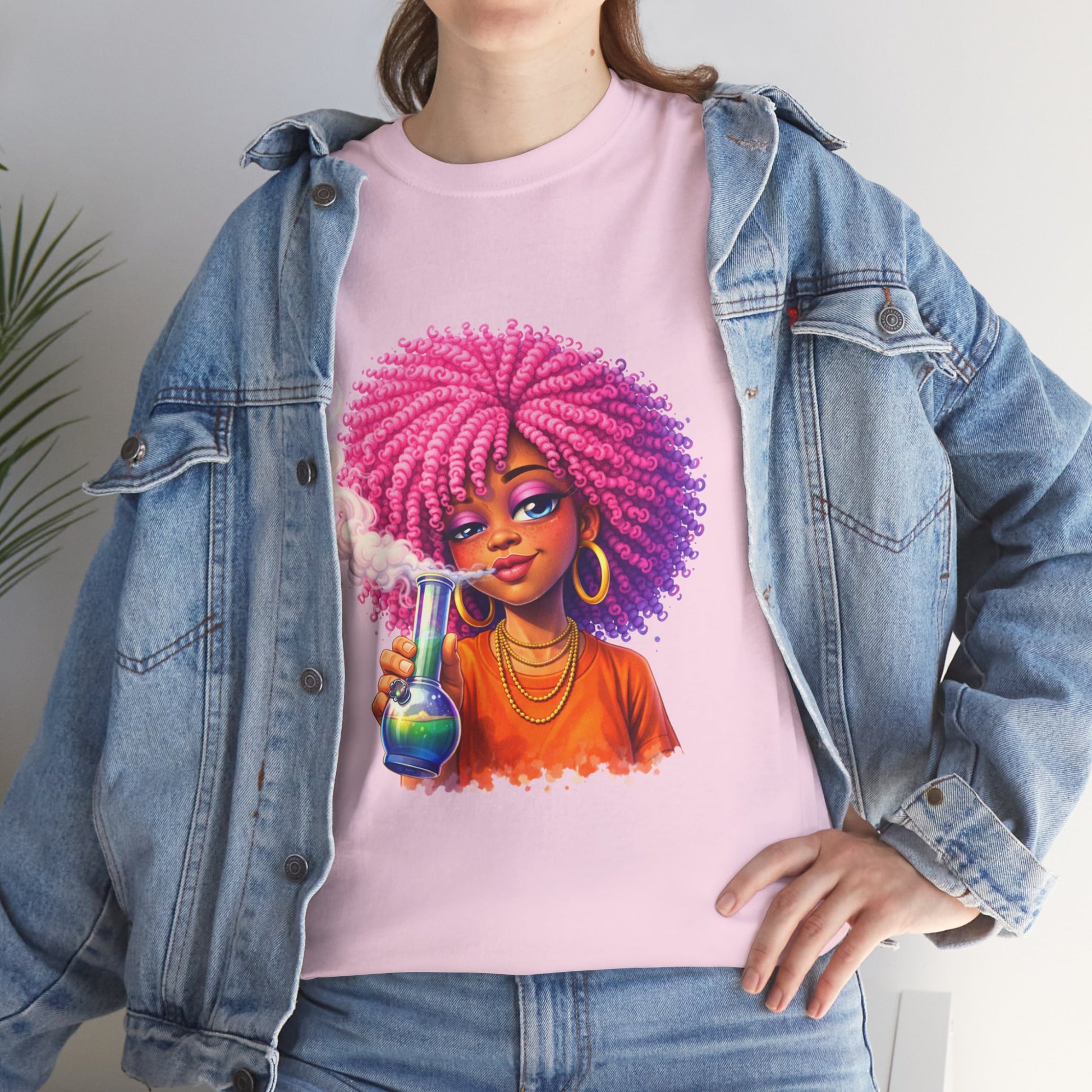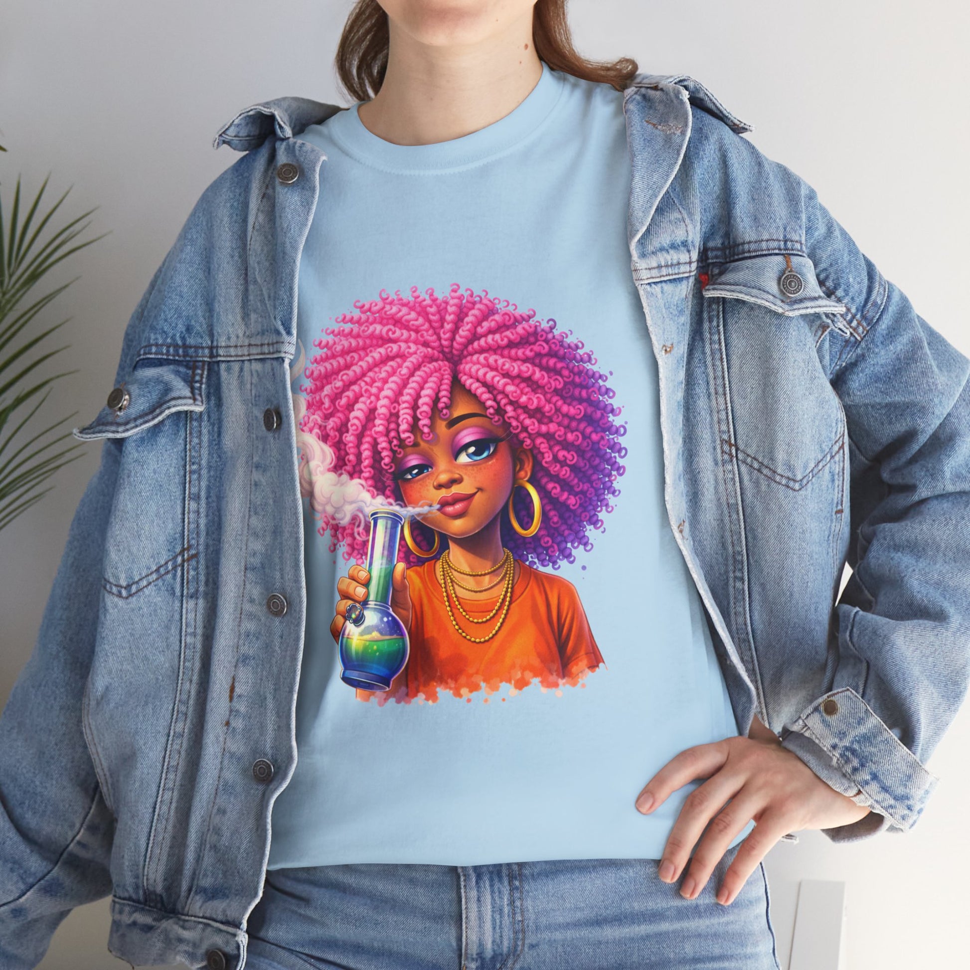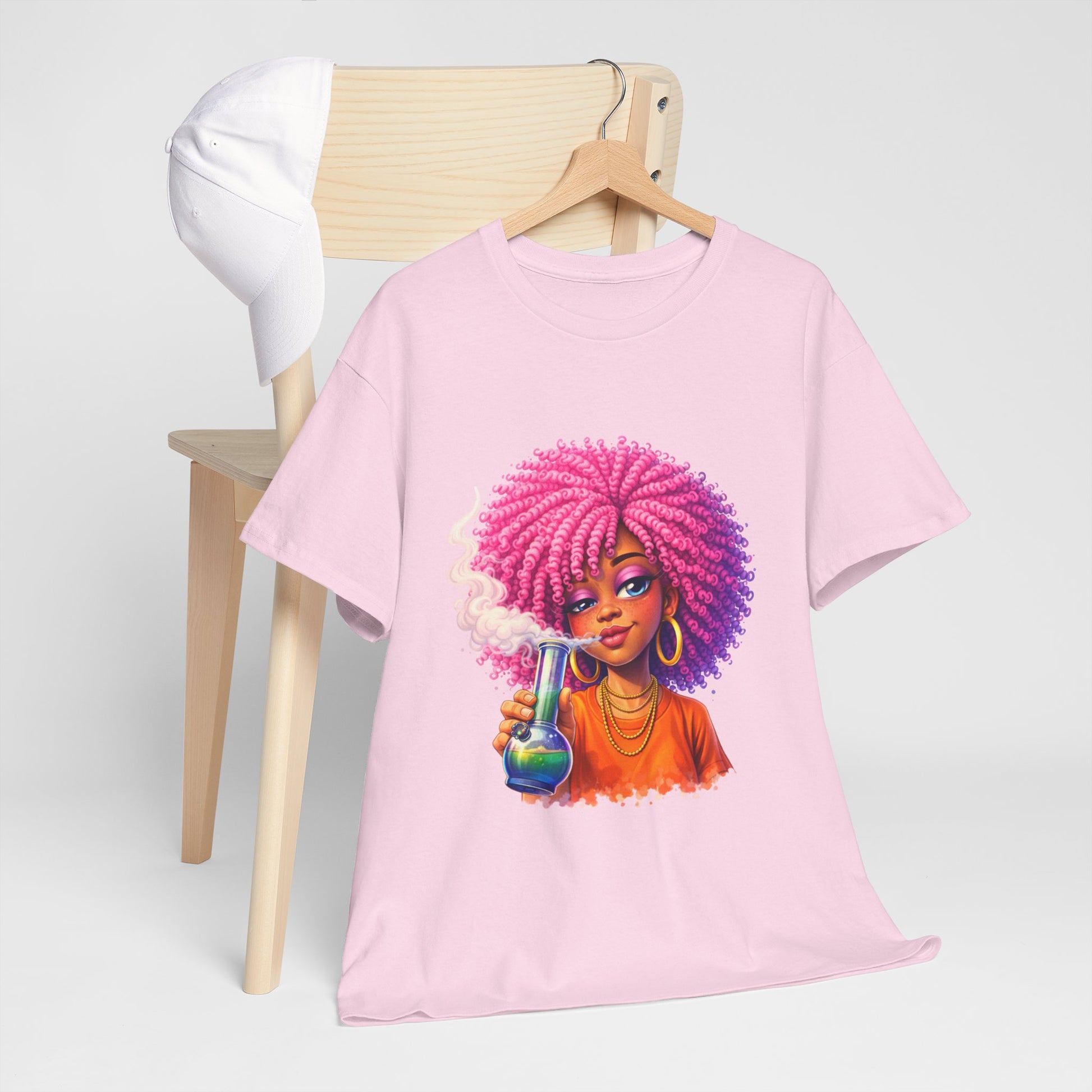 This soft, breathable tee carries a bright, playful portrait that feels like a snapshot from a late-afternoon hangout. The artwork shows a confident young woman with vivid pink hair, gold hoops, and a relaxed smile while holding a colorful beaker that lets off a dreamy puff of smoke—an image that blends urban style, creative curiosity, and a carefree vibe. Wear it to add a burst of color and personality to everyday jeans, layered streetwear, or low-key gatherings where conversation and creativity flow. The classic crew neck and slightly boxy silhouette sit comfortably on the shoulders and frame the print so the illustration pops without overpowering your look. It’s for people who enjoy bold self-expression and subtle humor, whether you’re sketching, chilling with friends, or exploring a local art fair.