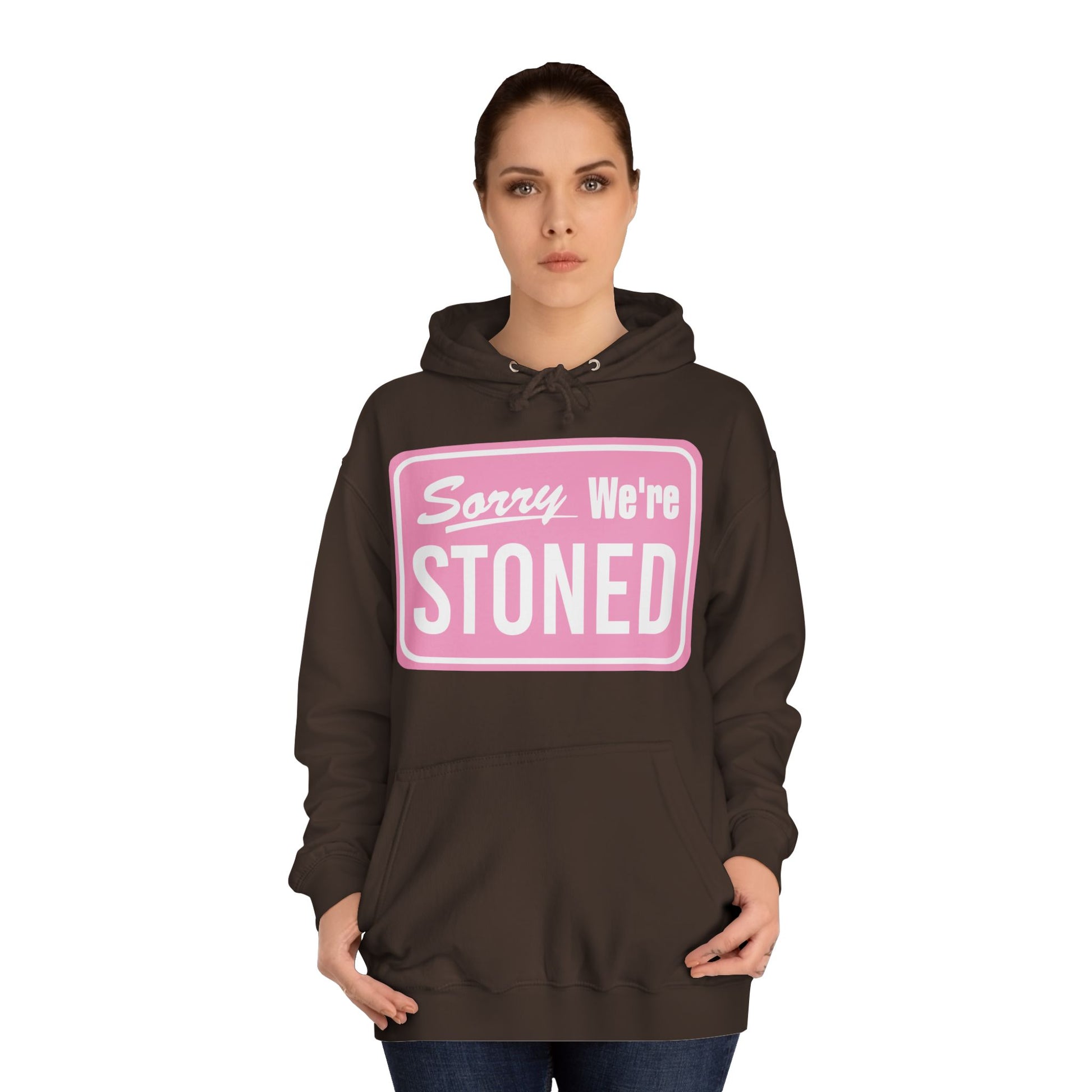 Sorry We're Stoned Hoodie — Funny Pink Graphic Pullover
