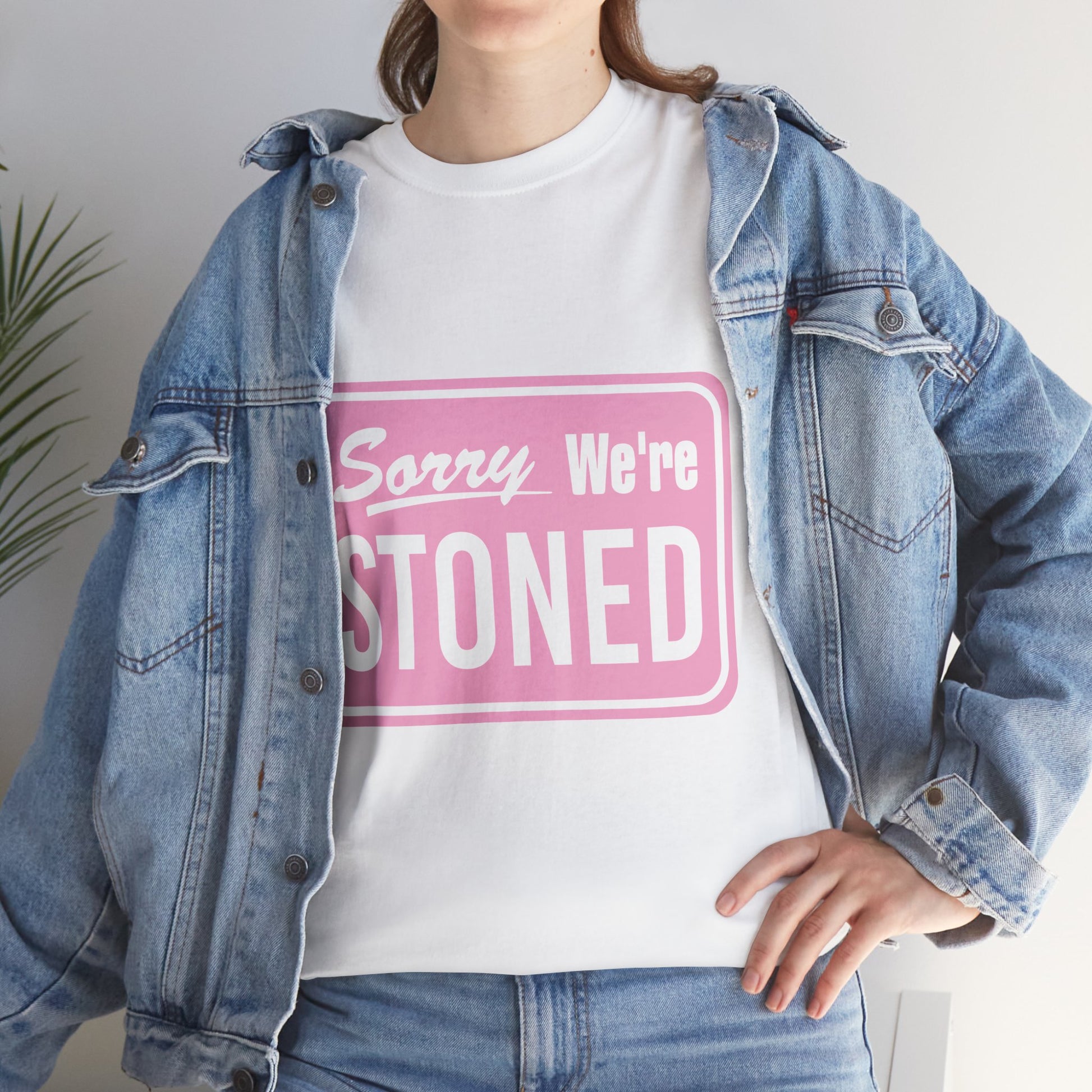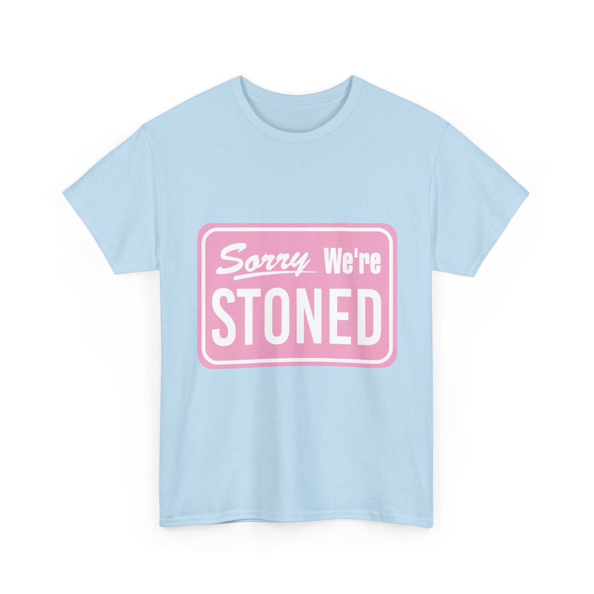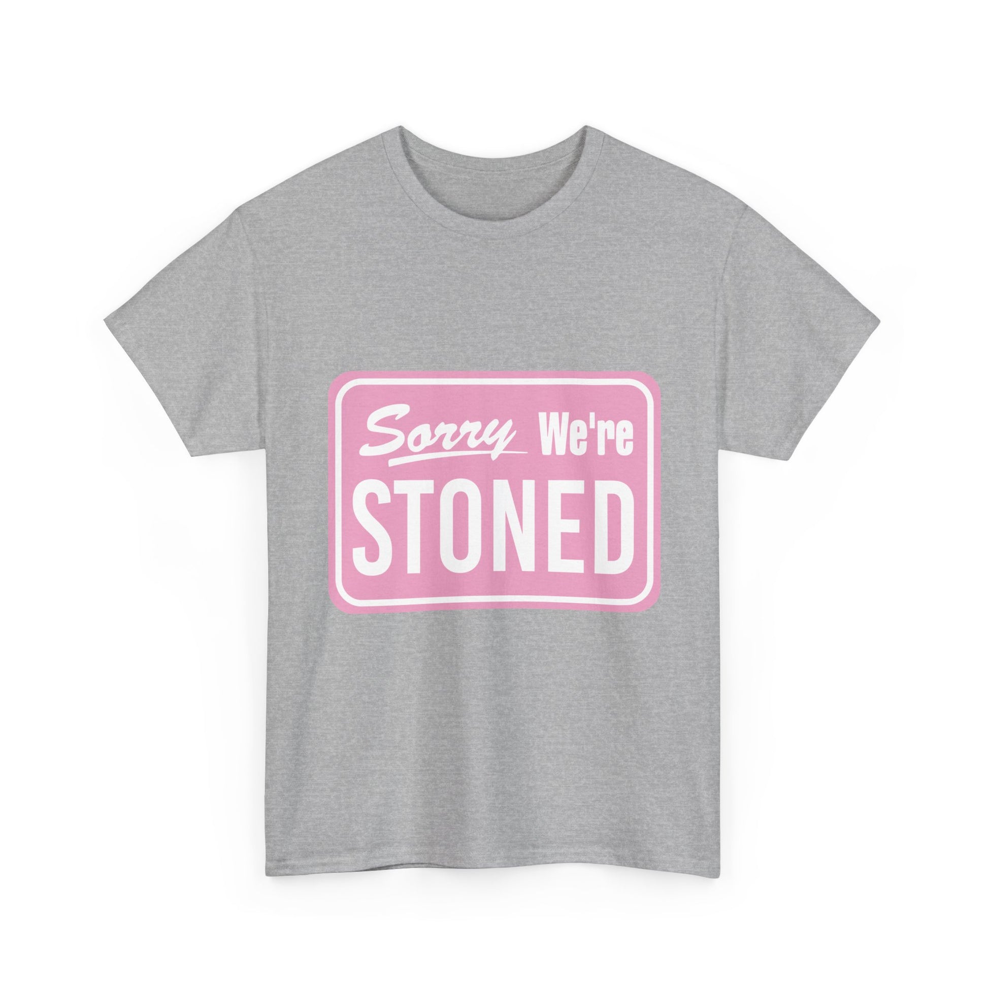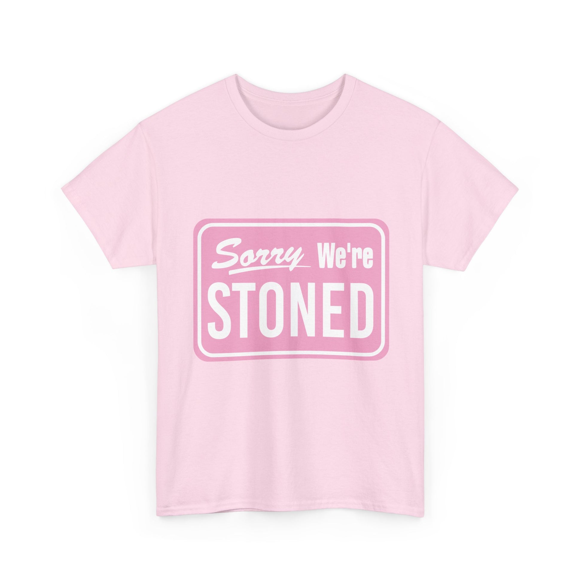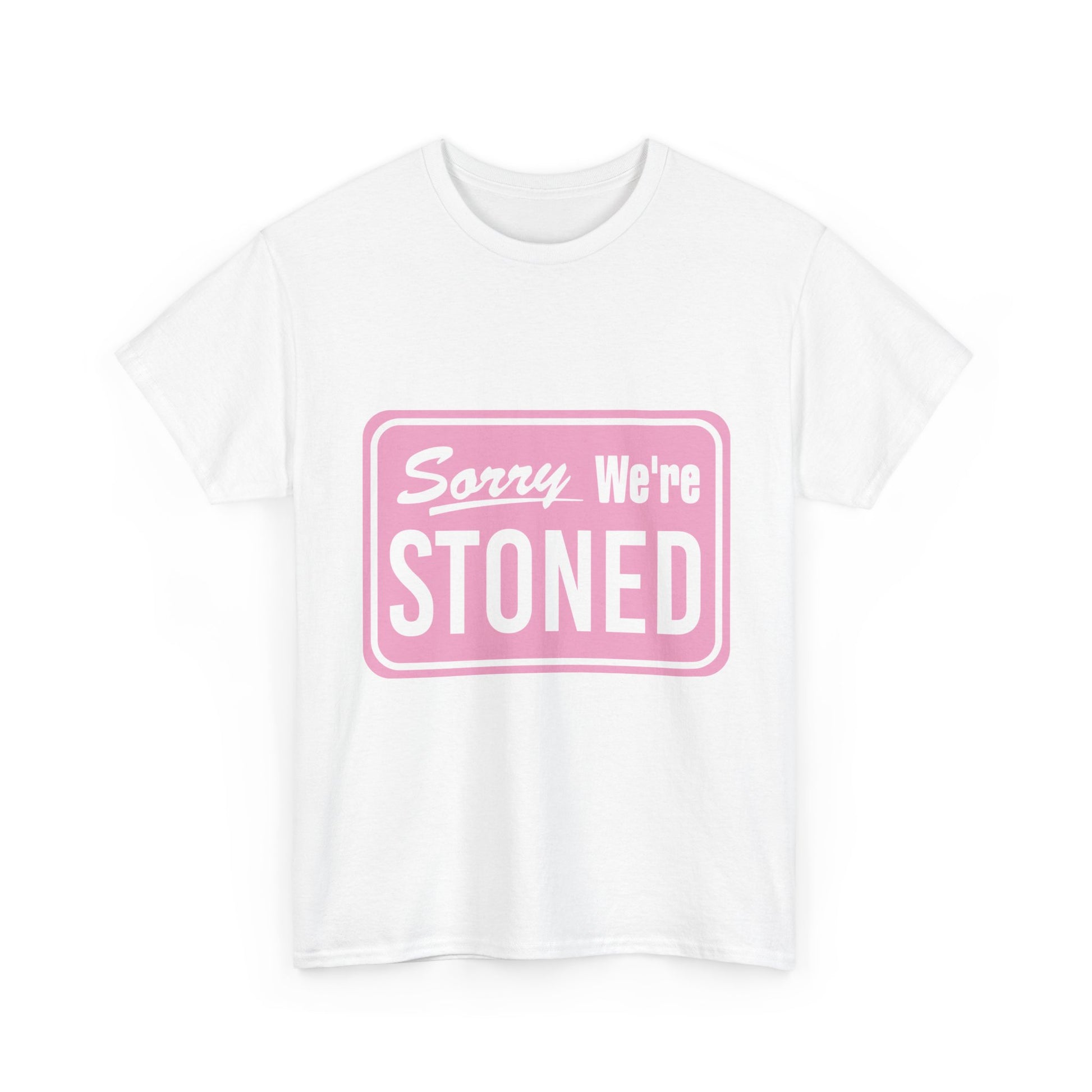Sorry We're Stoned Retro Graphic Tee — Pink Vintage Sign 420 Humor Shirt