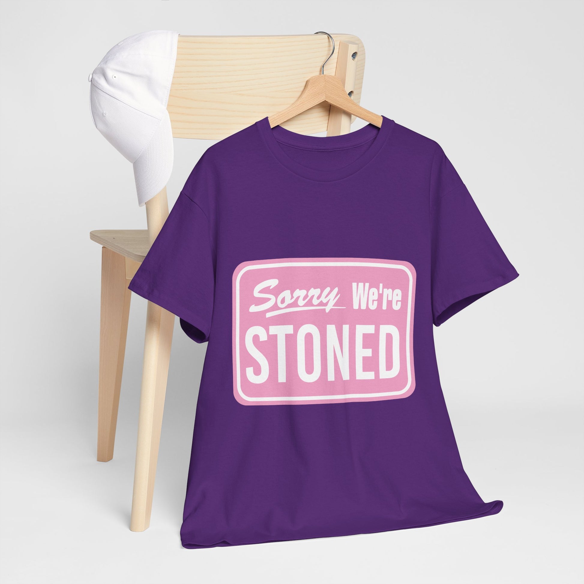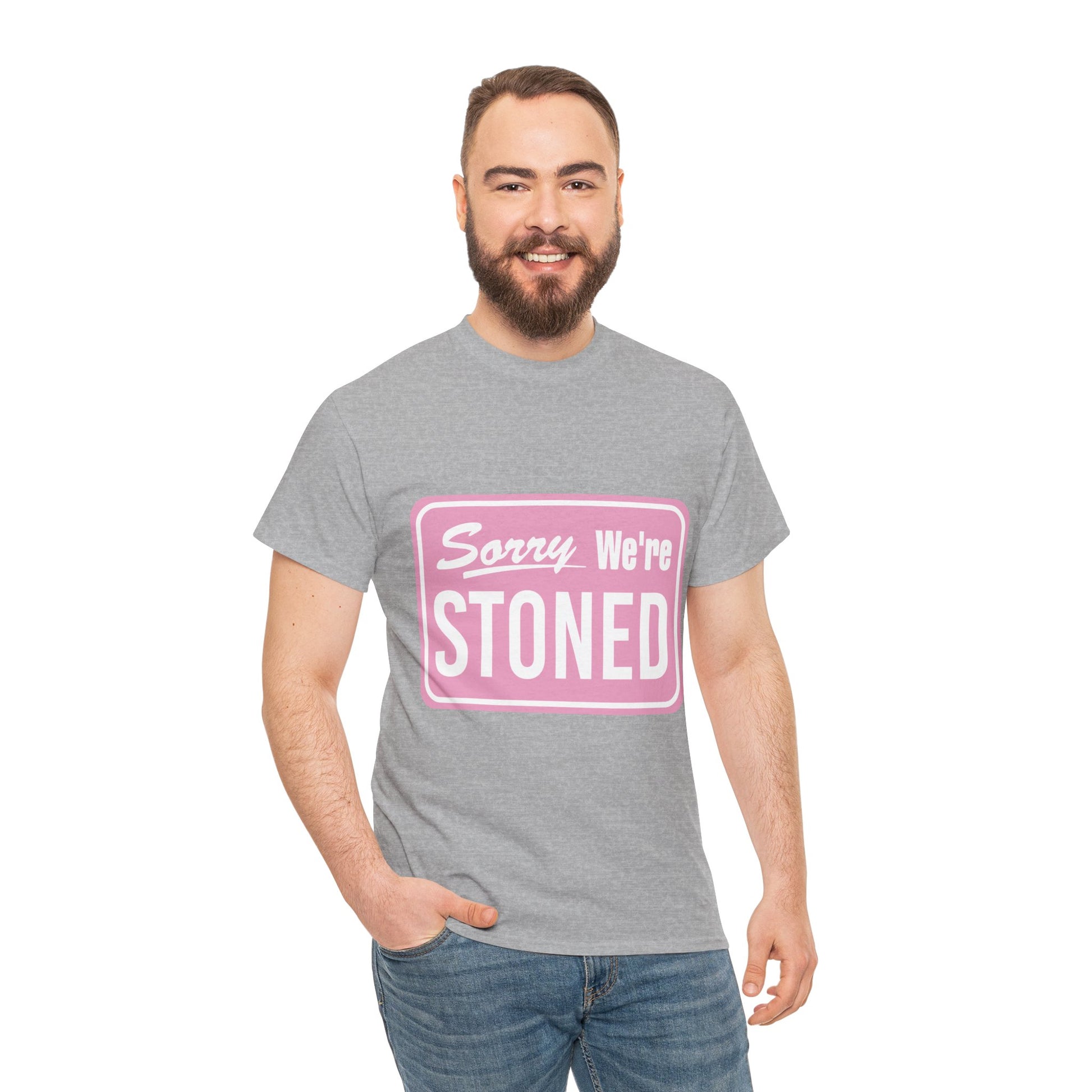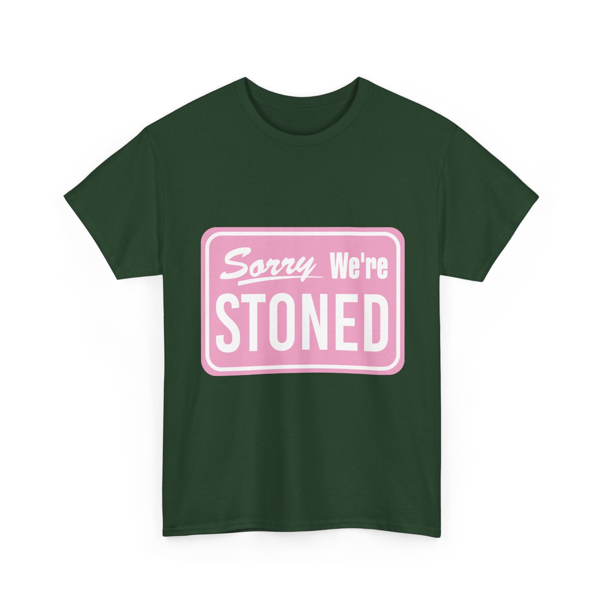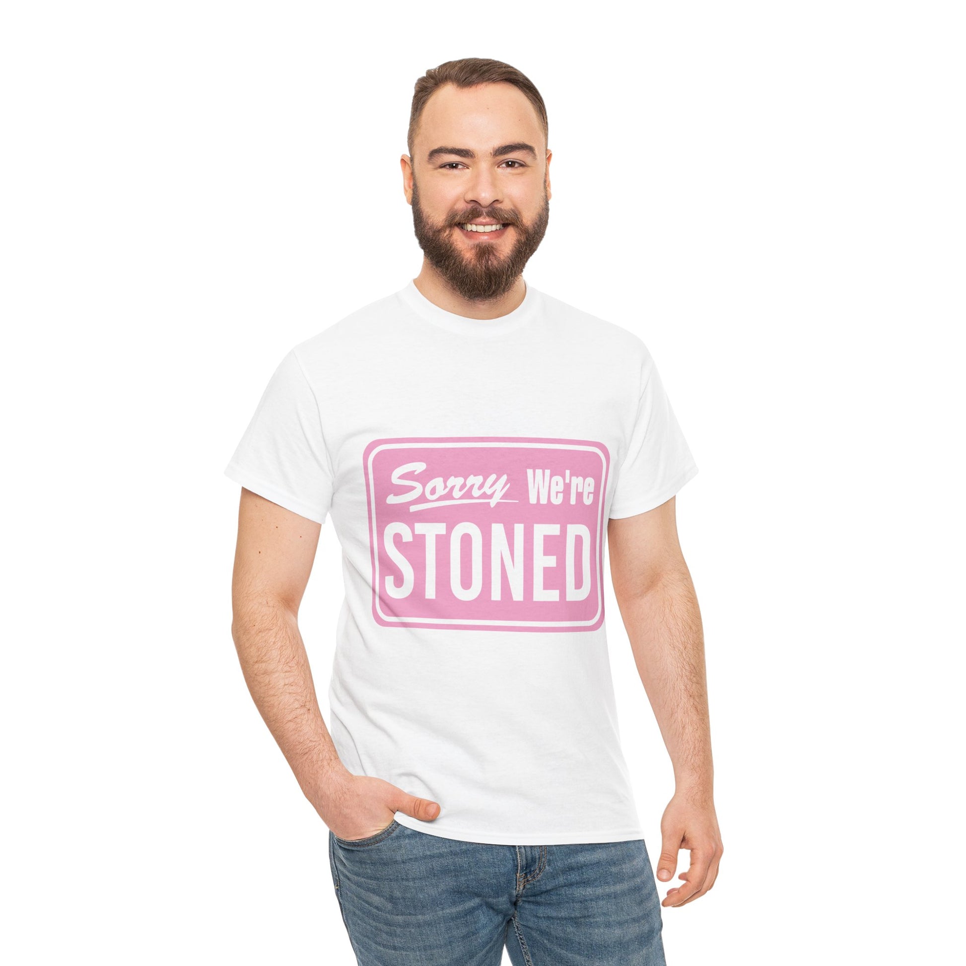 Sorry We're Stoned Retro Graphic Tee — Pink Vintage Sign 420 Humor Shirt