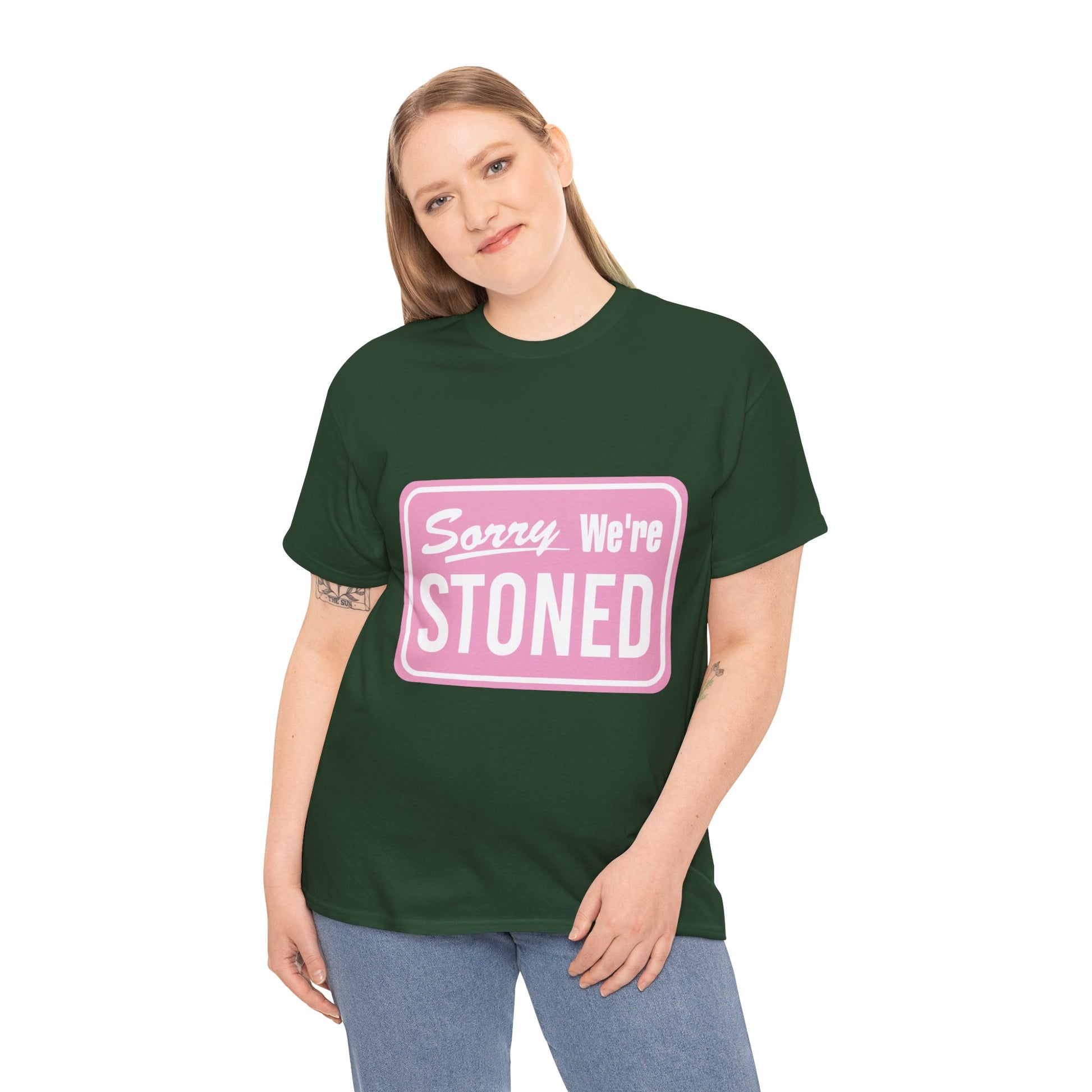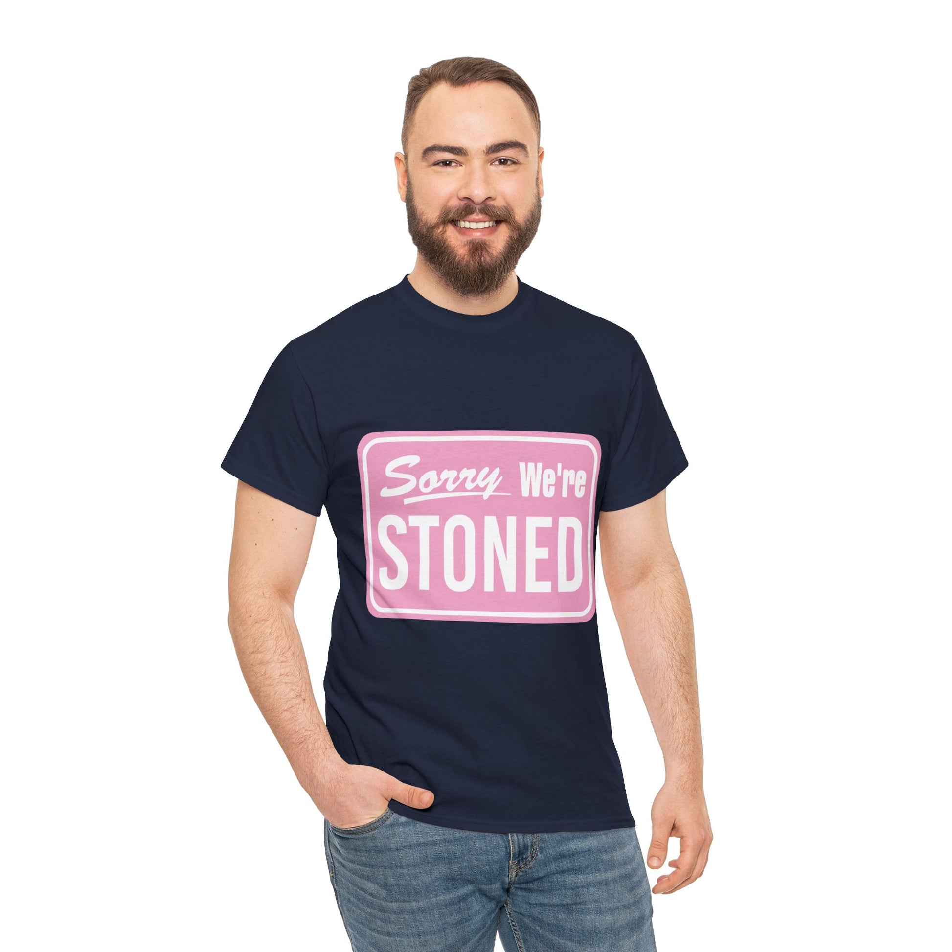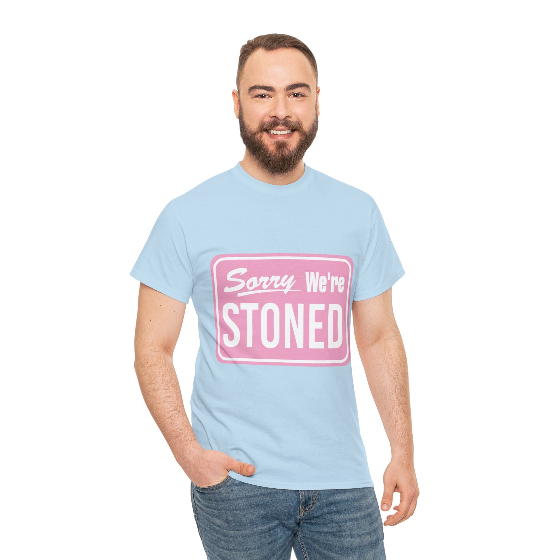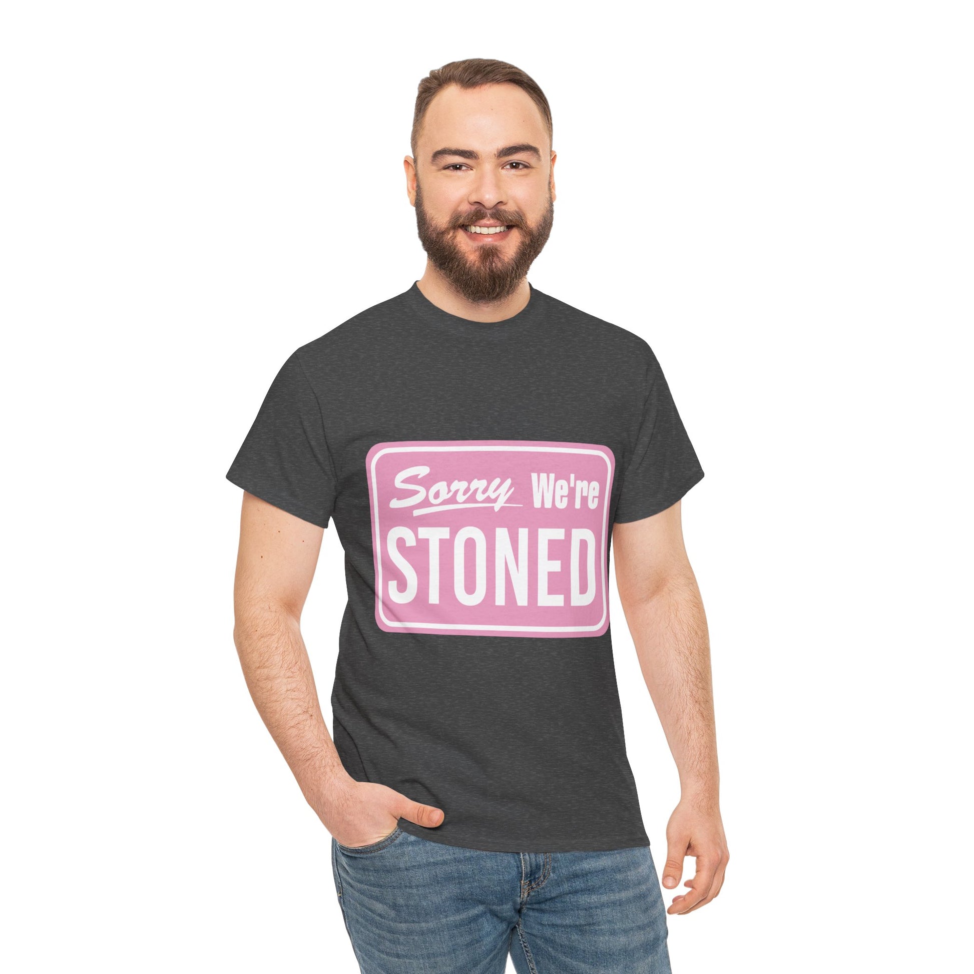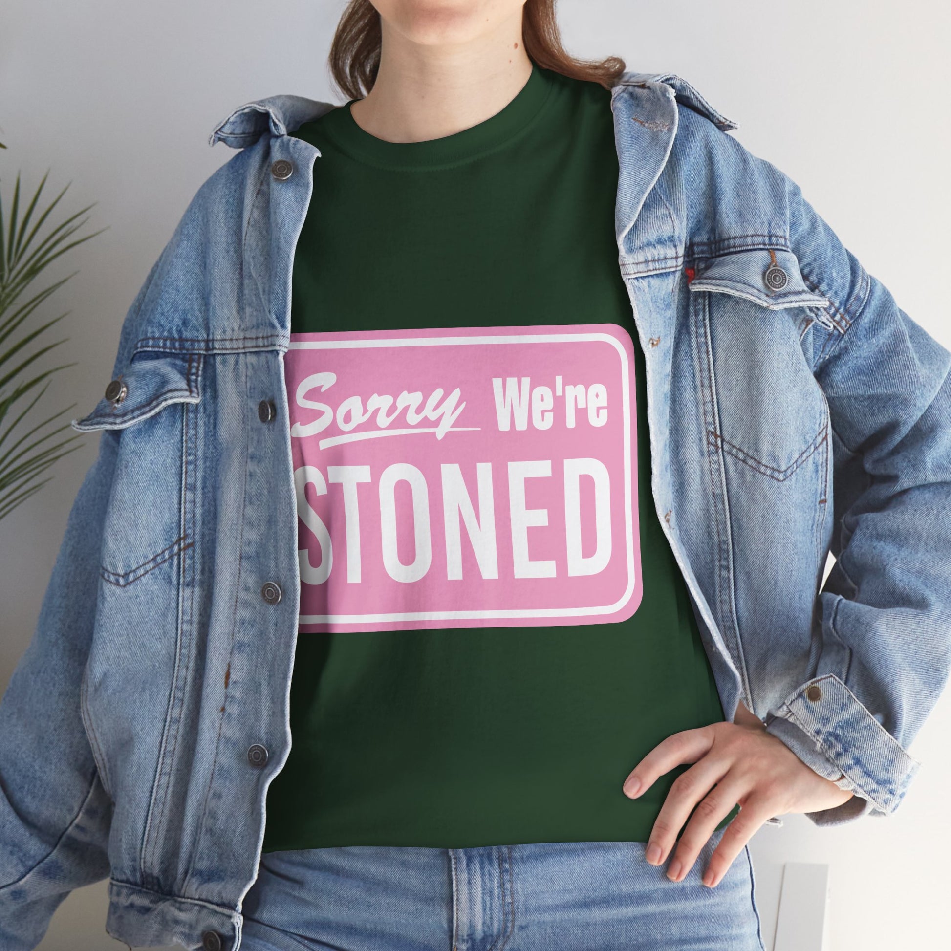 Sorry We're Stoned Retro Graphic Tee — Pink Vintage Sign 420 Humor Shirt