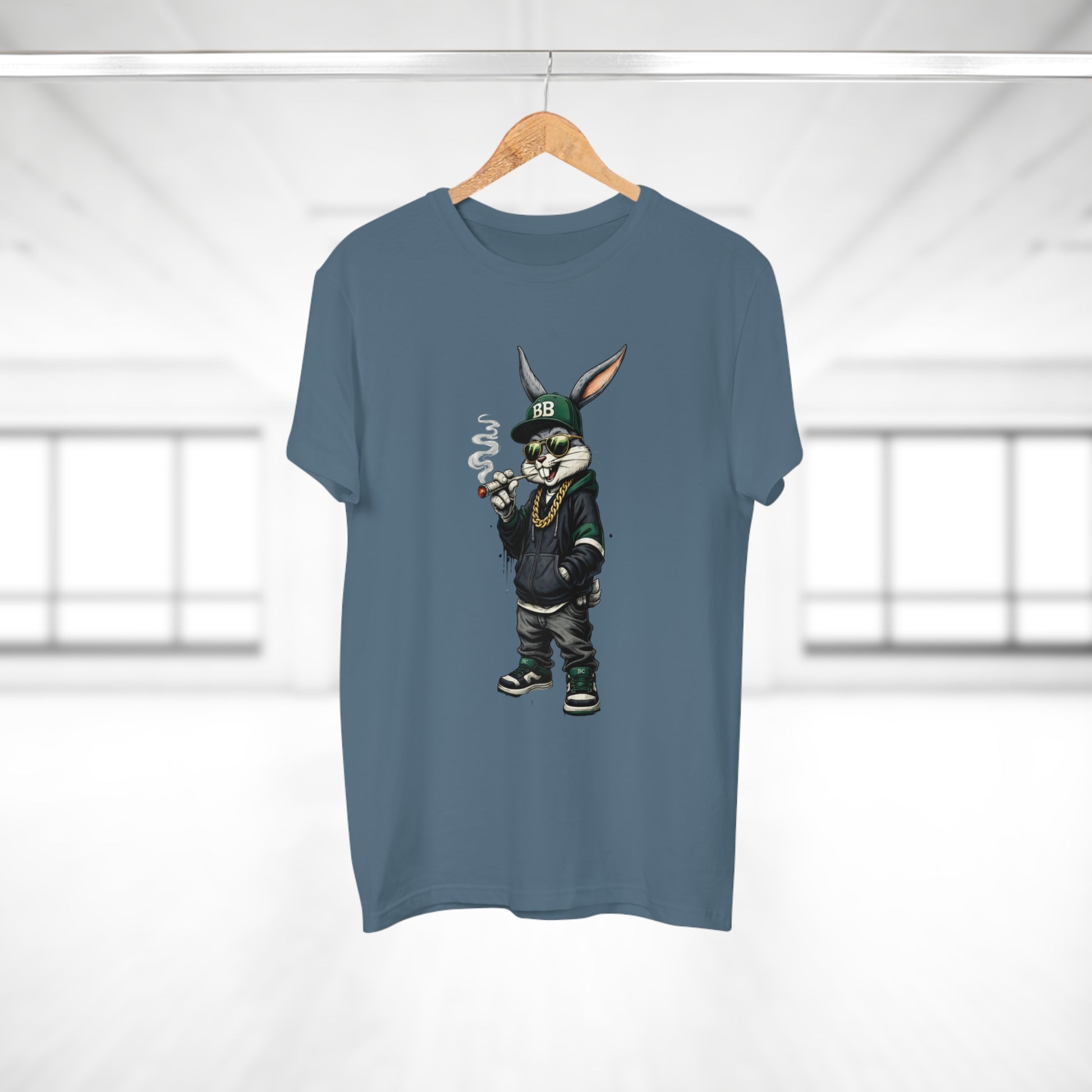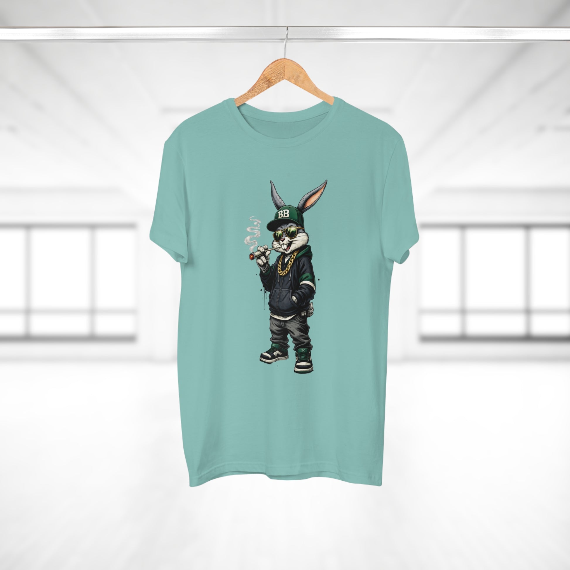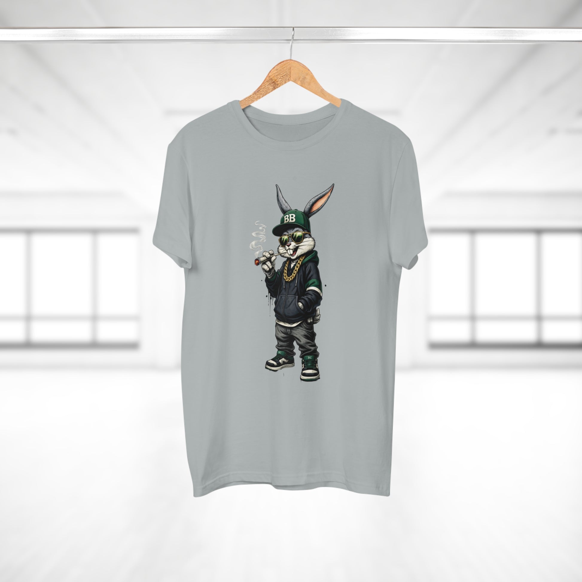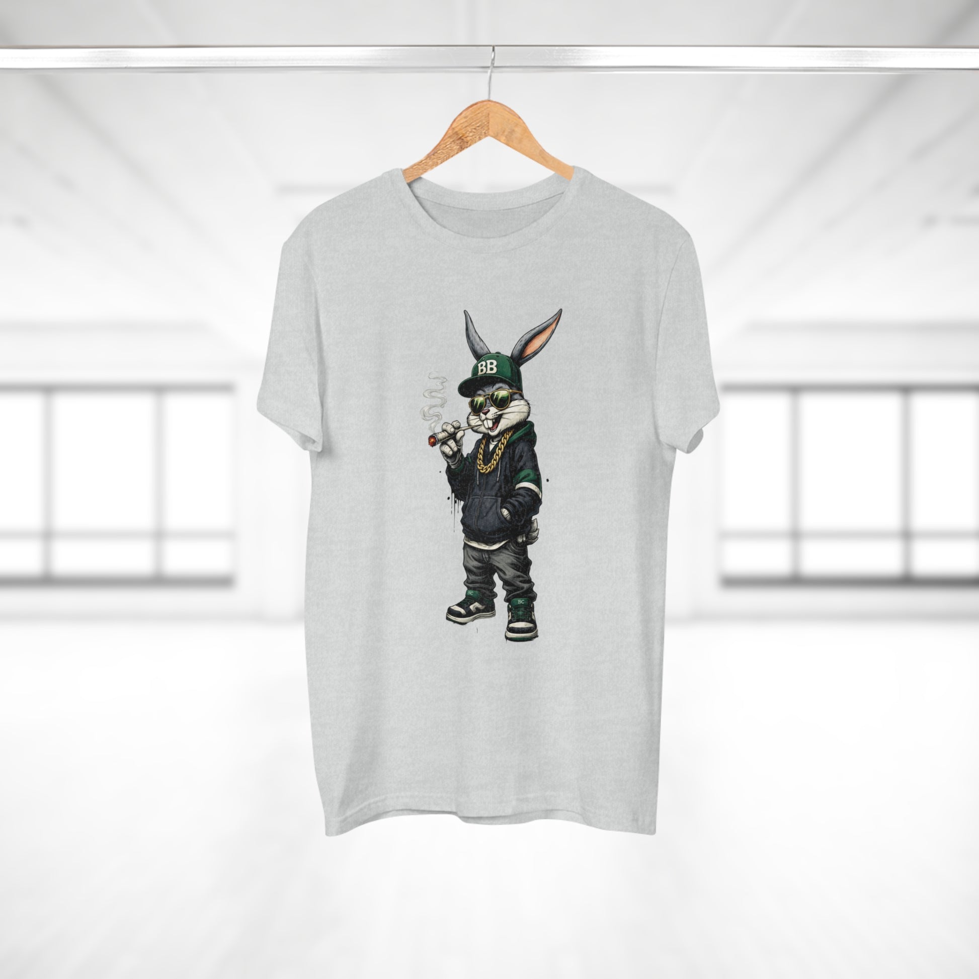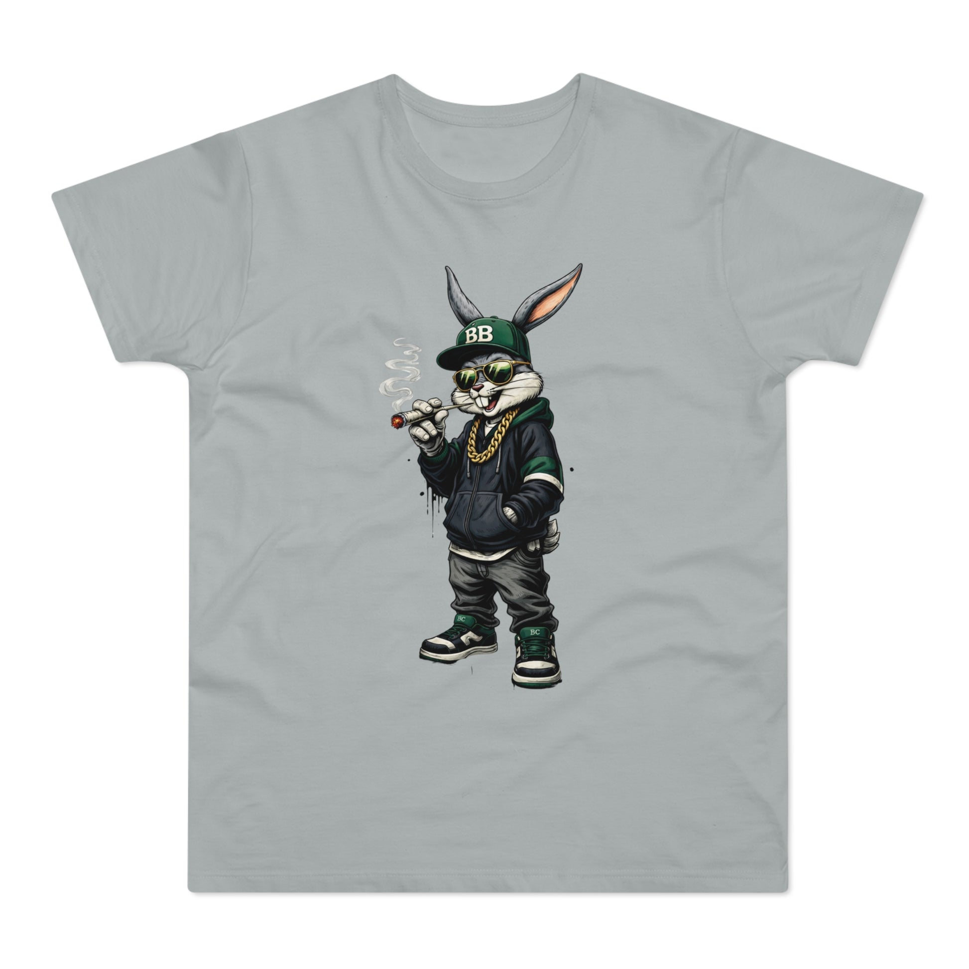 Casual, streetwise energy meets soft everyday wear. This lightweight single-jersey tee carries a bold graphic of a laid-back, hoodie-clad rabbit—smoking a small cigar, wearing a BB cap and gold chain—so it reads like a character sketch you’d spot on an urban block or at a skate park. The muted shirt color keeps attention on the detailed illustration while remaining easy to layer. Wear it with worn denim, high-tops, and a beanie to lean into the look, or let it stand alone for an offbeat, confident statement. The shirt feels breathable and lived-in from the first wear, and the collar and neck tape help it keep shape through many washes.