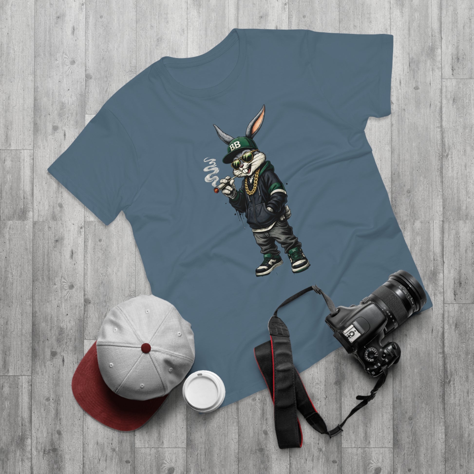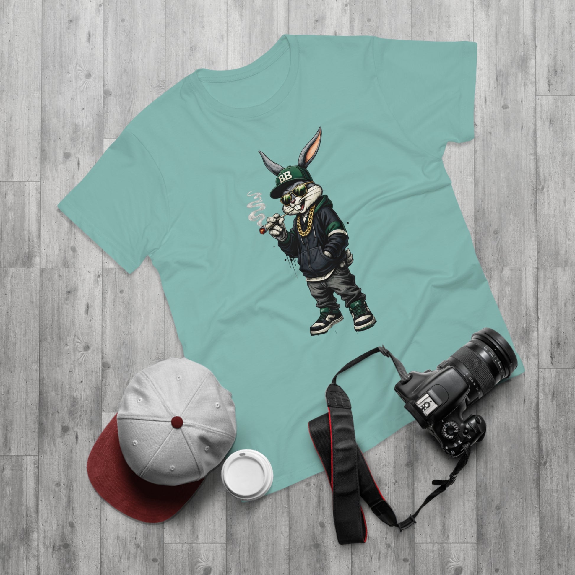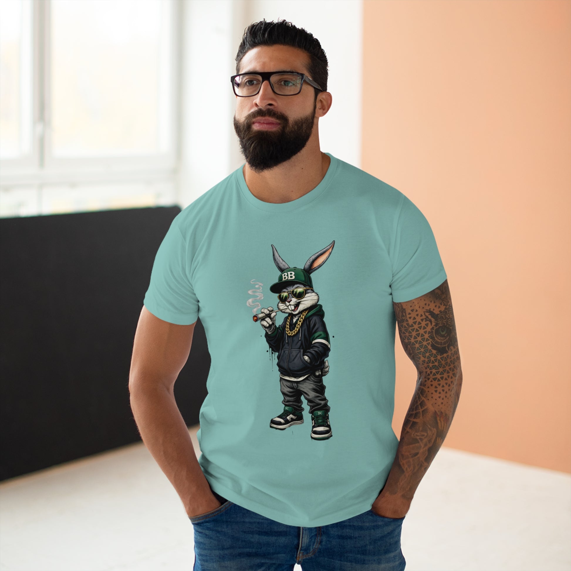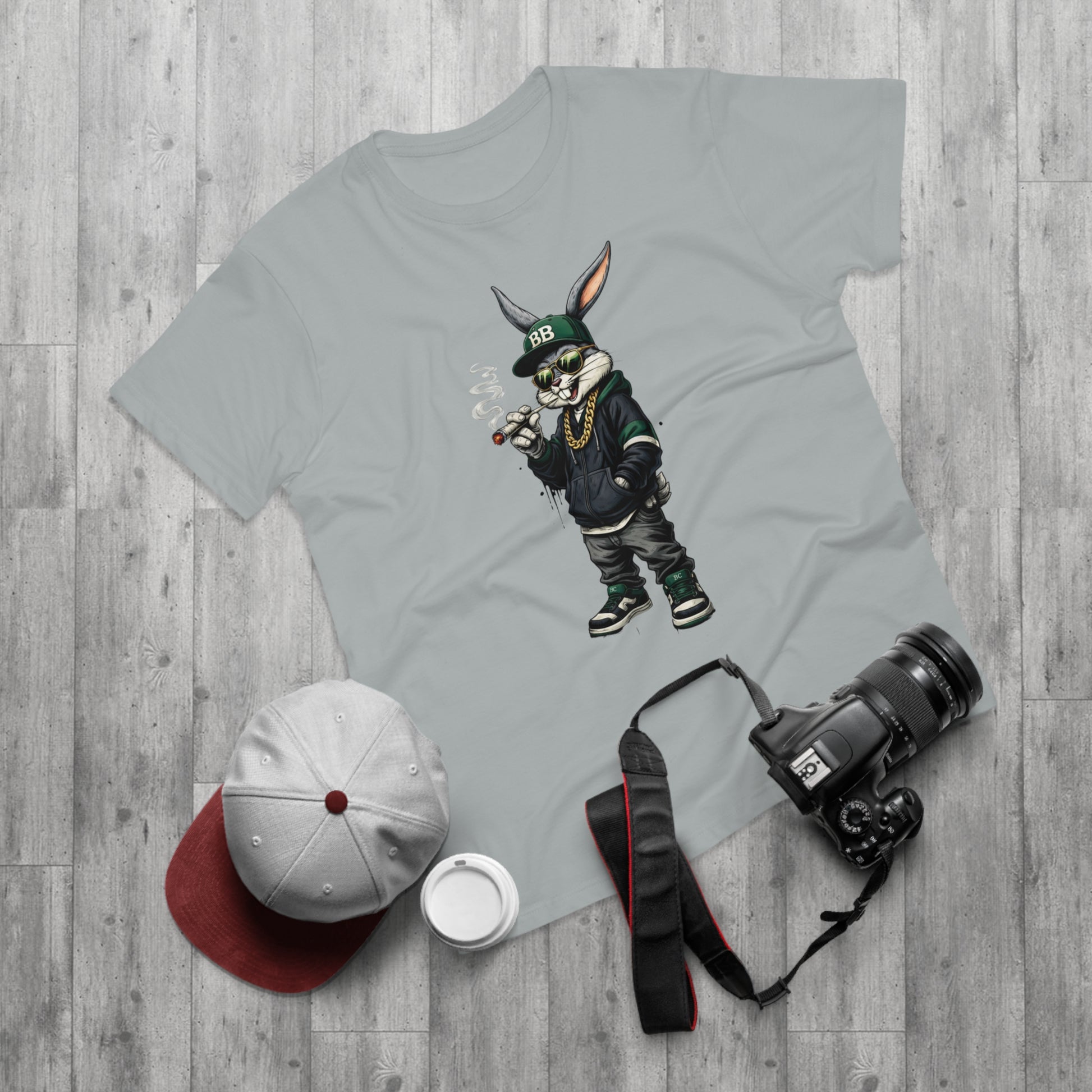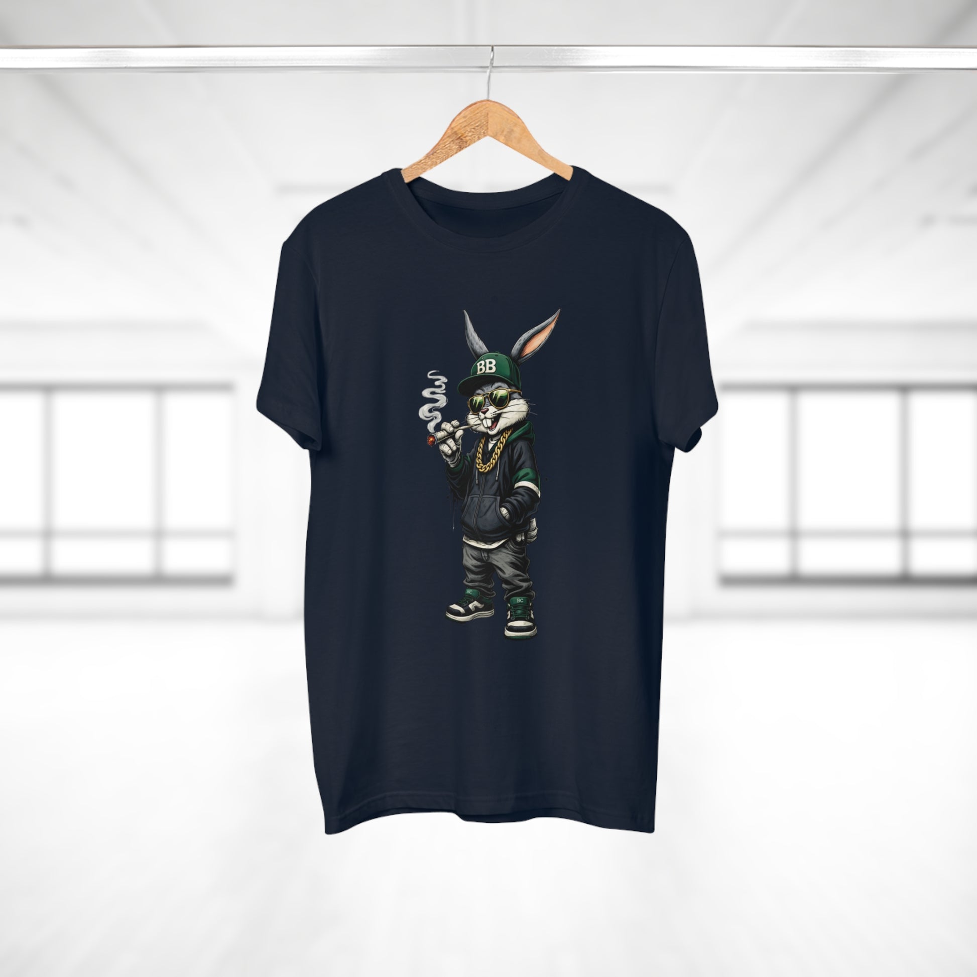 Casual, streetwise energy meets soft everyday wear. This lightweight single-jersey tee carries a bold graphic of a laid-back, hoodie-clad rabbit—smoking a small cigar, wearing a BB cap and gold chain—so it reads like a character sketch you’d spot on an urban block or at a skate park. The muted shirt color keeps attention on the detailed illustration while remaining easy to layer. Wear it with worn denim, high-tops, and a beanie to lean into the look, or let it stand alone for an offbeat, confident statement. The shirt feels breathable and lived-in from the first wear, and the collar and neck tape help it keep shape through many washes.