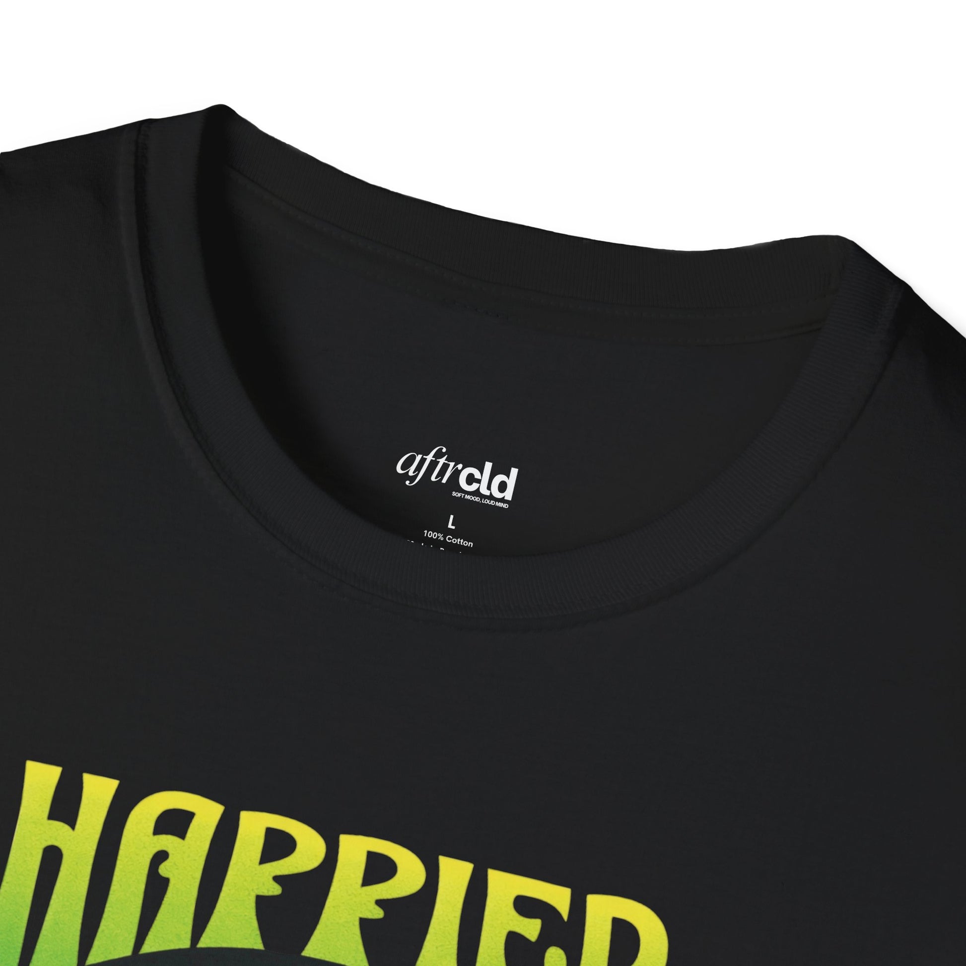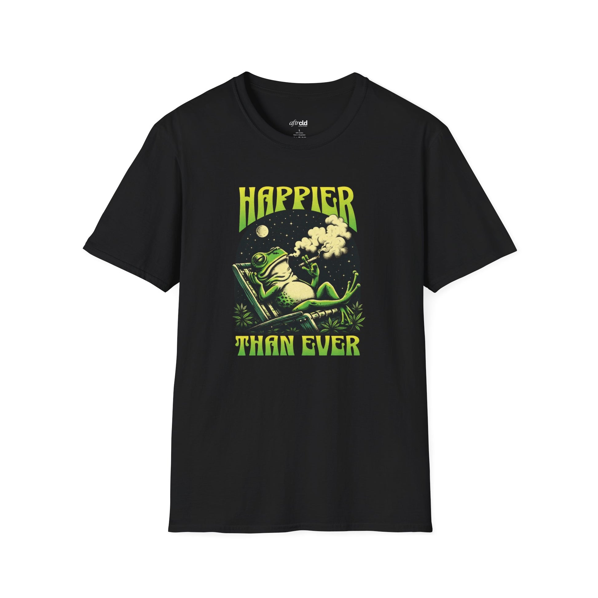 This laid-back tee carries a wry, stoner-surreal vibe: a relaxed frog reclining under the moon, exhaling a cloud while the bold words "HAPPIER THAN EVER" glow above and below. The lightweight, ring-spun cotton feels soft against the skin and drapes casually for all-day wear. Wear it when you want to lean into mellow evenings, backyard hangouts, late-night skate sessions, or low-key shows — it reads like a private joke shared between friends. The graphic pops in neon green tones on a dark background, giving it retro/psychedelic energy without shouting. Durable printing and a smooth knit mean the shirt keeps its look and comfort wash after wash.