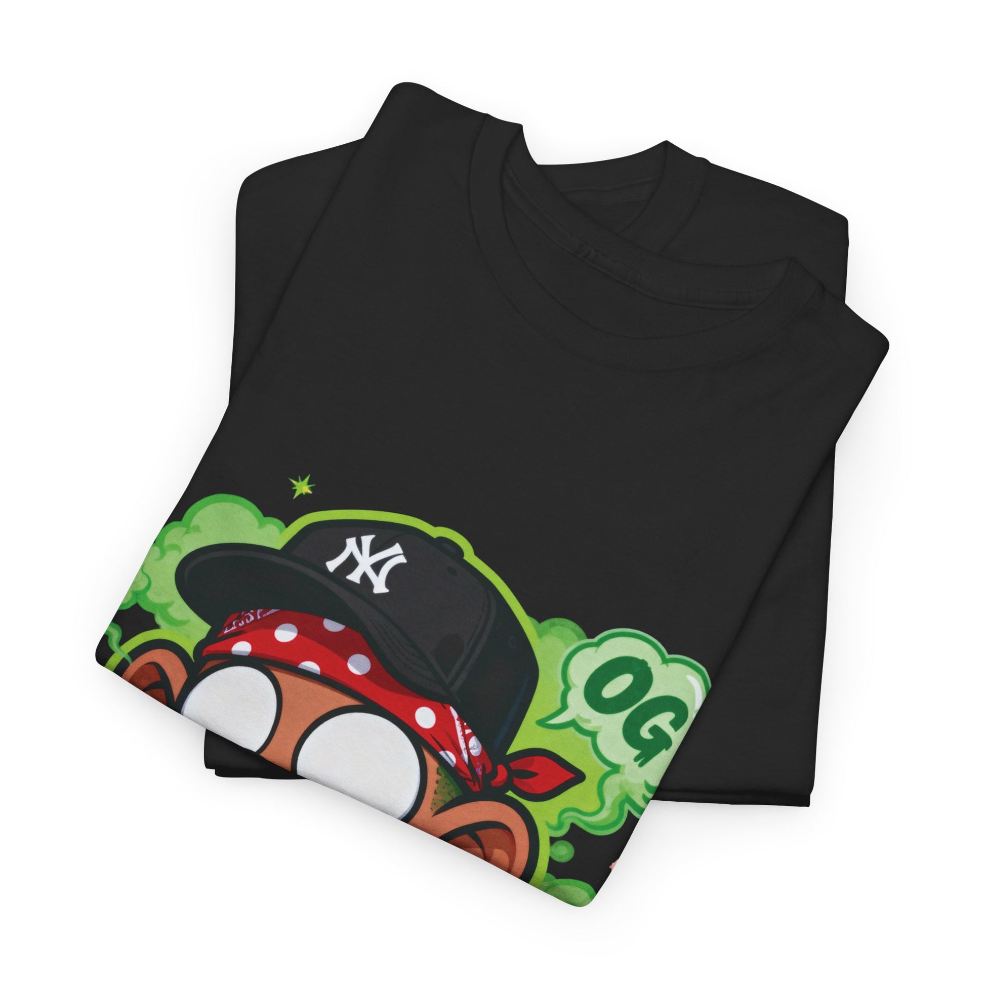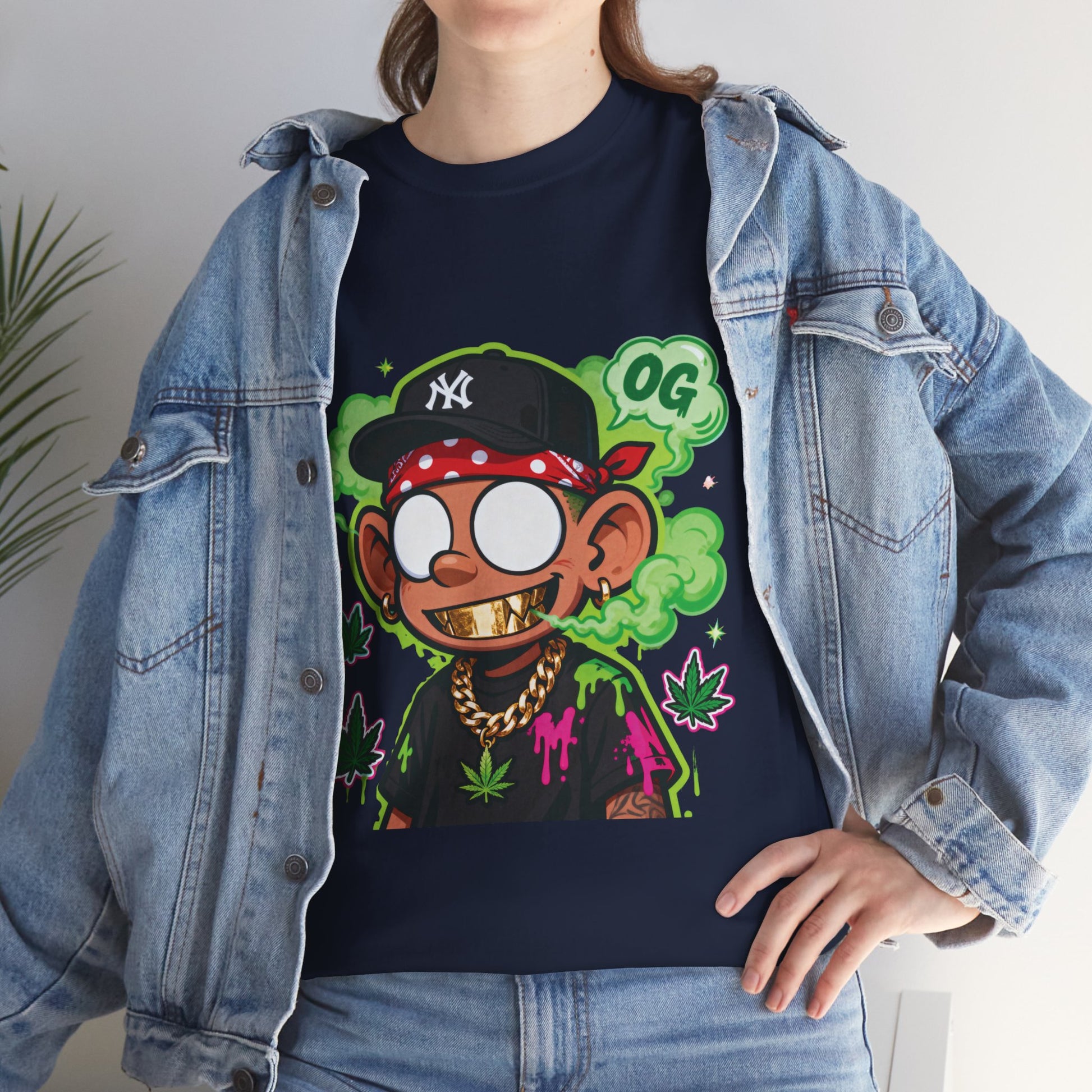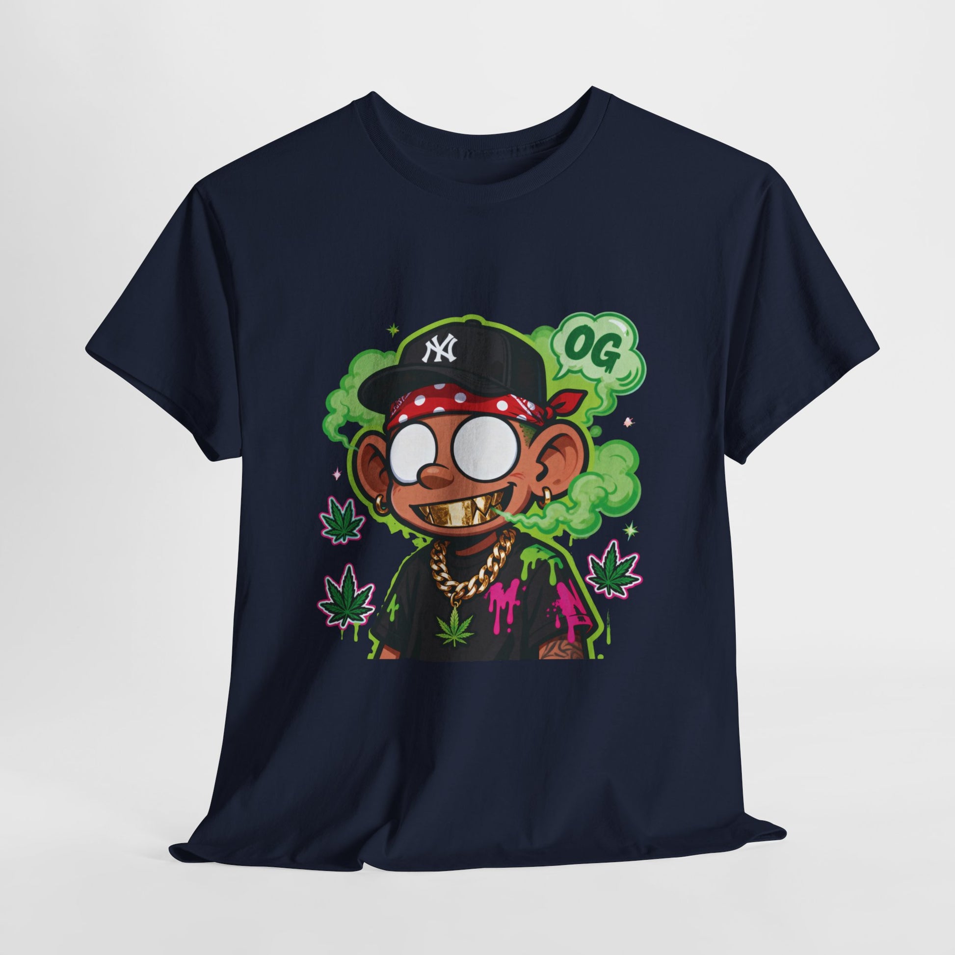 This relaxed cotton tee brings playful street-style energy to everyday wear. A bold, cartoon-style character sits centerstage — wide-eyed, gold chain glinting, bandana tied, with green smoke and stylized leaves as a cheeky backdrop. The design reads like a snapshot from urban art culture: bright neon outlines, confident attitude, and hand-drawn charm. Wear it to add a splash of rebellious fun to your rotation. It layers easily under a jacket, pairs with denim or joggers, and stands out in casual hangs, late-night runs, or art-fair strolls. The crew neck and classic fit keep the silhouette familiar and comfortable, while the sturdy cotton body takes prints well so the graphic keeps its punch wash after wash.